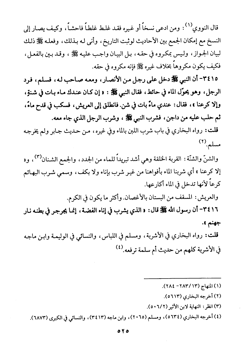 3415 - أن النبي - صلى الله عليه وسلم - دخل على رجل من الأنصار، ومعه صاحب له، فسلم، فرد الرجل، وهو يحوّل الماء في حائط، فقال النبي - صلى الله عليه وسلم -: "إن كان عندك ماء بات في شنةٍ، وإلا كرعنا"، فقال: عندي ماءٌ بات في شن. فانطلق إلى العريش، فسكب في قدح ماءً، ثم حلب عليه من داجن، فشرب النبي - صلى الله عليه وسلم -، وشرب الرجل الذي جاء معه.