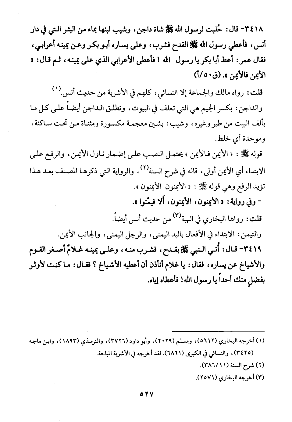 3418 - قال: حُلبت لرسول الله - صلى الله عليه وسلم - شاة داجن، وشيب لبنها بماء من البئر التي في دار أنس، فأعطي رسول الله - صلى الله عليه وسلم - القدح فشرب، وعلى يساره أبو بكر وعن يمينه أعرابي، فقال عمر: أعط أبا بكر يا رسول الله! فأعطى الأعرابي الذي على يمينه، ثم قال: "الأيمن فالأيمن".