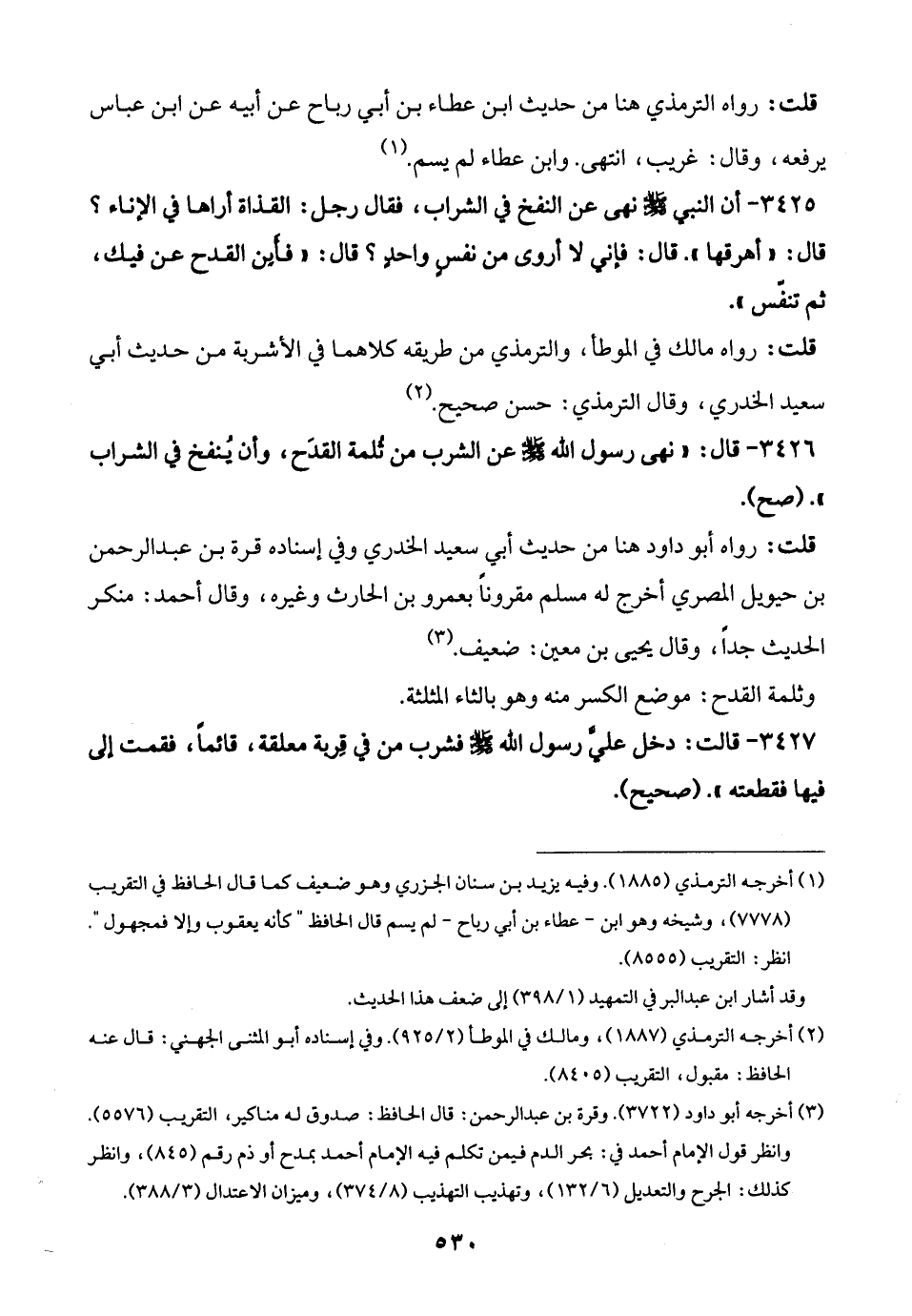3426 - قال: "نهى رسول الله - صلى الله عليه وسلم - عن الشرب من ثُلمة القدَح، وأن يُنفخ في الشراب". (صح).