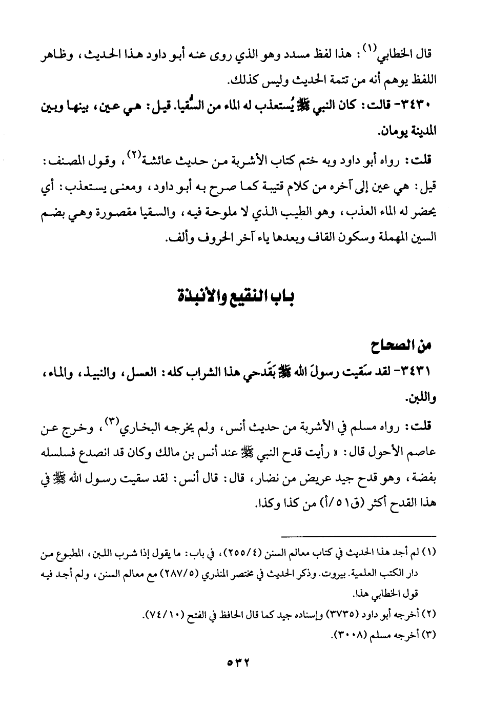 3430 - قالت: كان النبي - صلى الله عليه وسلم - يُستعذب له الماء من السُّقيا. قيل: هي عين، بينها وبين المدينة يومان.