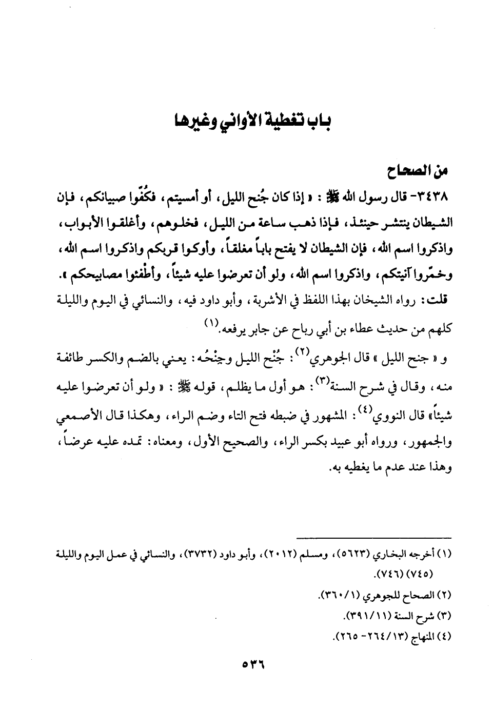3438 - قال رسول الله - صلى الله عليه وسلم -: "إذا كان جُنح الليل، أو أمسيتم، فكُفّوا صبيانكم، فإن الشيطان ينتشر حينئذ، فإذا ذهب ساعة من الليل، فخلوهم، وأغلقوا الأبواب، واذكروا اسم الله، فإن الشيطان لا يفتح بابًا مغلقًا، وأوكوا قربكم واذكروا اسم الله، وخمّروا آنيتكم، واذكروا اسم الله، ولو أن تعرضوا عليه شيئًا، وأطفئوا مصابيحكم".