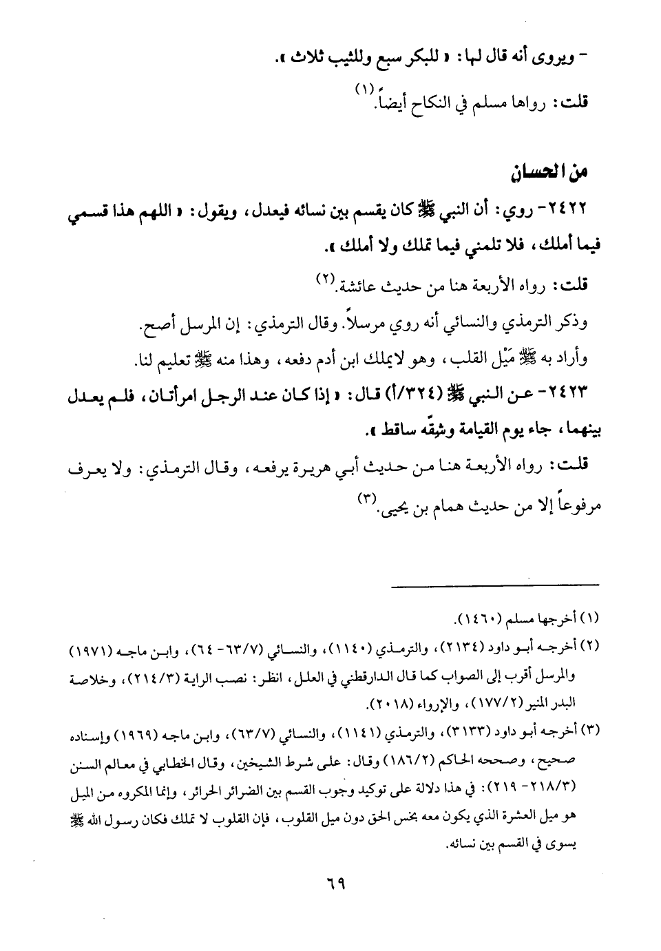 (¬3) أخرجه أبو داود (3133)، والترمذي (1141)، والنسائي (7/ 63)، وابن ماجه (1969) وإسناده صحيح، وصححه الحاكم (2/ 186) وقال: على شرط الشيخين، وقال الخطابي في معالم السنن (3/ 218 - 219): في هذا دلالة على توكيد وجوب القسم بين الضرائر الحرائر، وإنما المكروه من الميل هو ميل العشرة الذي يكون معه بخس الحق دون ميل القلوب، فإن القلوب لا تملك فكان رسول الله - صلى الله عليه وسلم - يسوى في القسم بين نسائه.