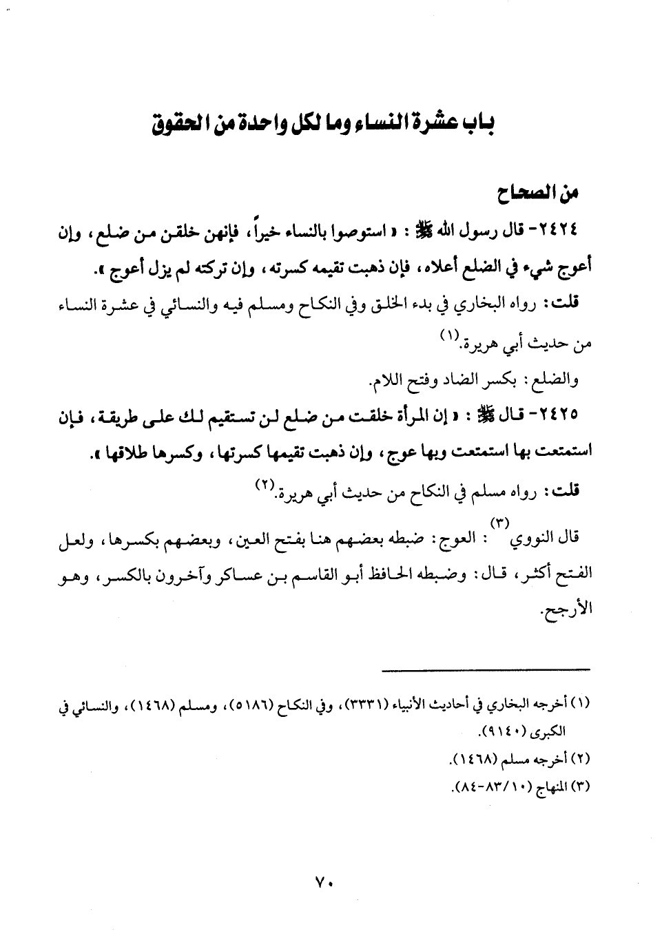 2424 - قال رسول الله - صلى الله عليه وسلم -: "استوصوا بالنساء خيرًا، فإنهن خلقن من ضلع، وإن أعوج شيء في الضلع أعلاه، فإن ذهبت تقيمه كسرته، وإن تركته لم يزل أعوج".