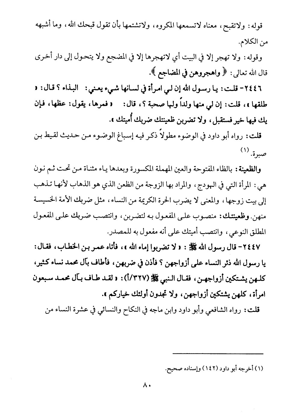 2446 - قلت: يا رسول الله إن لي امرأة في لسانها شيء يعني: البذاء؟ قال: "طلقها"، قلت: إن لي منها ولدًا ولها صحبة؟، قال: "فمرها، يقول: عظها، فإن يك فيها خير فستقبل، ولا تضربن ظعينتك ضربك أُميتك".