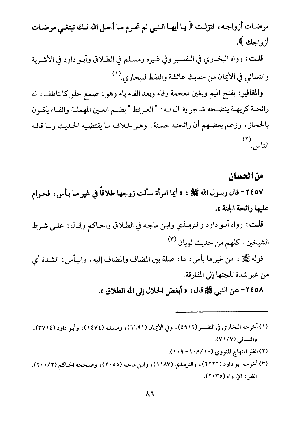 2457 - قال رسول الله - صلى الله عليه وسلم -: "أيما امرأة سألت زوجها طلاقًا في غير ما بأس، فحرام عليها رائحة الجنة".