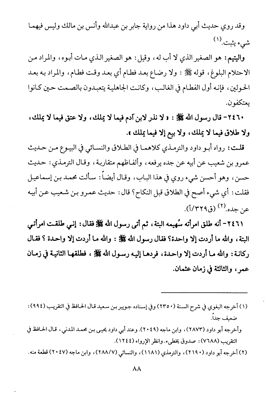 2461 - أنه طلق امرأته سُهيمه البتة، ثم أتى رسول الله - صلى الله عليه وسلم - فقال: إني طلقت امرأتي البتة، والله ما أردت إلا واحدة؟ فقال رسول الله - صلى الله عليه وسلم -: والله ما أردت إلا واحدة؟ فقال ركانة: والله ما أردت إلا واحدة، فردها إليه رسول الله - صلى الله عليه وسلم -، فطلقها الثانية في زمان عمر، والثالثة في زمان عثمان.