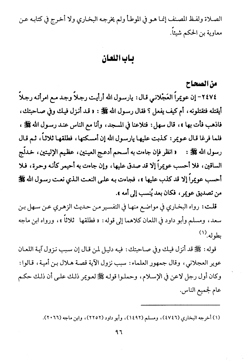 2474 - إن عويمرًا العَجْلاني قال: يا رسول الله أرأيت رجلًا وجد مع امرأته رجلًا أيقتله فتقتلونه، أم كيف يفعل؟ فقال رسول الله - صلى الله عليه وسلم -: "قد أنزل فيك وفي صاحبتك، فاذهب فأت بها"، قال سهل: فتلاعنا في المسجد، وأنا مع الناس عند رسول الله - صلى الله عليه وسلم -، فلما فرغا قال عويمر: كذبت عليها يا رسول الله إن أمسكتها، فطلقها ثلاثًا، ثم قال رسول الله - صلى الله عليه وسلم -: "انظر فإن جاءت به أسحم أدعج العينين، عظيم الإليتين، خدلّج الساقين، فلا أحسب عويمرًا إلا قد صدق عليها، وإن جاءت به أحيمر كأنه وحرة، فلا أحسب عويمرًا إلا قد كذب عليها"، فجاءت به على النعت الذي نعت رسول الله - صلى الله عليه وسلم - من تصديق عويمر، فكان بعد يُنسب إلى أمه".