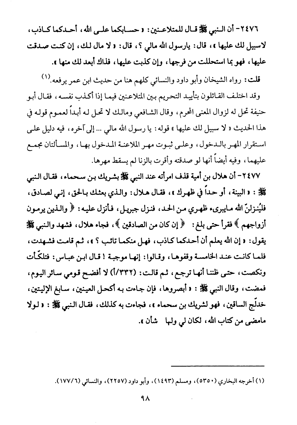 2477 - أن هلال بن أمية قذف امرأته عند النبي - صلى الله عليه وسلم - بشريك بن سحماء، فقال النبي - صلى الله عليه وسلم -: "البينة، أو حدًّا في ظهرك"، فقال هلال: والذي بعثك بالحق، إني لصادق، فليُنزلنّ الله ما يبرىء ظهري من الحد، فنزل جبريل، فأنزل عليه: {وَالَّذِينَ يَرْمُونَ أَزْوَاجَهُمْ} فقرأ حتى بلغ: {إِنْ كَانَ مِنَ الصَّادِقِينَ}، فجاء هلال، فشهد والنبي - صلى الله عليه وسلم - يقول: "إن الله يعلم أن أحدكما كاذب، فهل منكما تائب؟ "، ثم قامت فشهدت، فلما كانت عند الخامسة وقفوها، وقالوا: إنها موجبة! قال ابن عباس: فتلكّأت ونكصت، حتى ظننا أنها ترجع، ثم قالت: لا أفضح قومي سائر اليوم، فمضت، وقال النبي - صلى الله عليه وسلم -: "أبصروها، فإن جاءت به أكحل العينين، سابغ الإليتين، خدلّج الساقين، فهو لشريك بن سحماء"، فجاءت به كذلك، فقال النبي - صلى الله عليه وسلم -: "لولا ما مضى من كتاب الله، لكان لي ولها شأن".