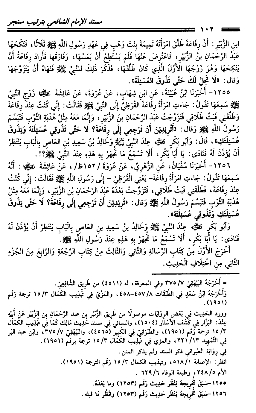 1255 - أَخْبَرَنَا ابْنُ عُيَيْنَةَ، عَنِ ابْنِ شِهَابٍ، عَنْ عُرْوَةَ، عَنْ عَائِشَةَ رَضِيَ اللَّهُ عَنْهَا زَوْجِ النَّبِيِّ صَلَّى اللَّهُ عَلَيْهِ وَسَلَّمَ سَمِعَهَا تَقُولُ: جَاءَتِ امْرَأَةُ رِفَاعَةَ الْقُرَظِيِّ إِلَى النَّبِيِّ صَلَّى اللَّهُ عَلَيْهِ وَسَلَّمَ فَقَالَتْ: إِنِّي كُنْتُ عِنْدَ رِفَاعَةَ وَطَلَّقَنِي فَبَتَّ طَلاقِي فَتَزَوَّجْتُ عَبْدَ الرَّحْمَنِ بْنَ الزُّبَيْرِ، وَإِنَّمَا مَعَهُ مِثْلُ هُدْبَةِ الثَّوْبِ، فَتَبَسَّمَ رَسُولُ اللَّهِ صَلَّى اللَّهُ عَلَيْهِ وَسَلَّمَ، وَقَالَ: «أَتُرِيدِينَ أَنْ تَرْجِعِي إِلَى رِفَاعَةَ؟ لا حَتَّى تَذُوقِي عُسَيْلَتَهُ وَيَذُوقَ عُسَيْلَتَكِ» ، قَالَ: وَأَبُو بَكْرٍ رَضِيَ اللَّهُ عَنْهُ عِنْدَ النَّبِيِّ صَلَّى اللَّهُ عَلَيْهِ وَسَلَّمَ وَخَالِدُ بْنُ سَعِيدِ بْنِ الْعَاصِ بِالْبَابِ يَنْتَظِرُ أَنْ يُؤْذَنَ لَهُ فَنَادَى: يَا أَبَا بَكْرٍ، أَلا تَسْمَعُ مَا تَجْهَرُ بِهِ هَذِهِ عِنْدَ النَّبِيِّ صَلَّى اللَّهُ عَلَيْهِ وَسَلَّمَ؟ ! .