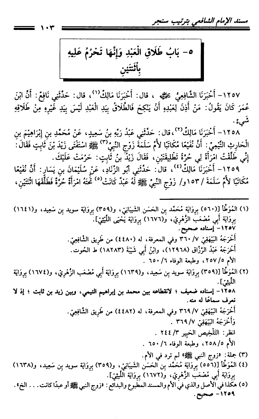 1259 - أَخْبَرَنَا مَالِكٌ، قَالَ: حَدَّثَنِي أَبُو الزِّنَادِ، عَنْ سُلَيْمَانَ بْنِ يَسَارٍ: أَنَّ نُفَيْعًا مُكَاتِبًا لأُمِّ سَلَمَةَ زَوْجِ النَّبِيِّ صَلَّى اللَّهُ عَلَيْهِ وَسَلَّمَ لَهُ عَبْدٌ كَانَتْ تَحْتَهُ امْرَأَةٌ حُرَّةٌ فَطَلَّقَهَا اثْنَتَيْنِ،