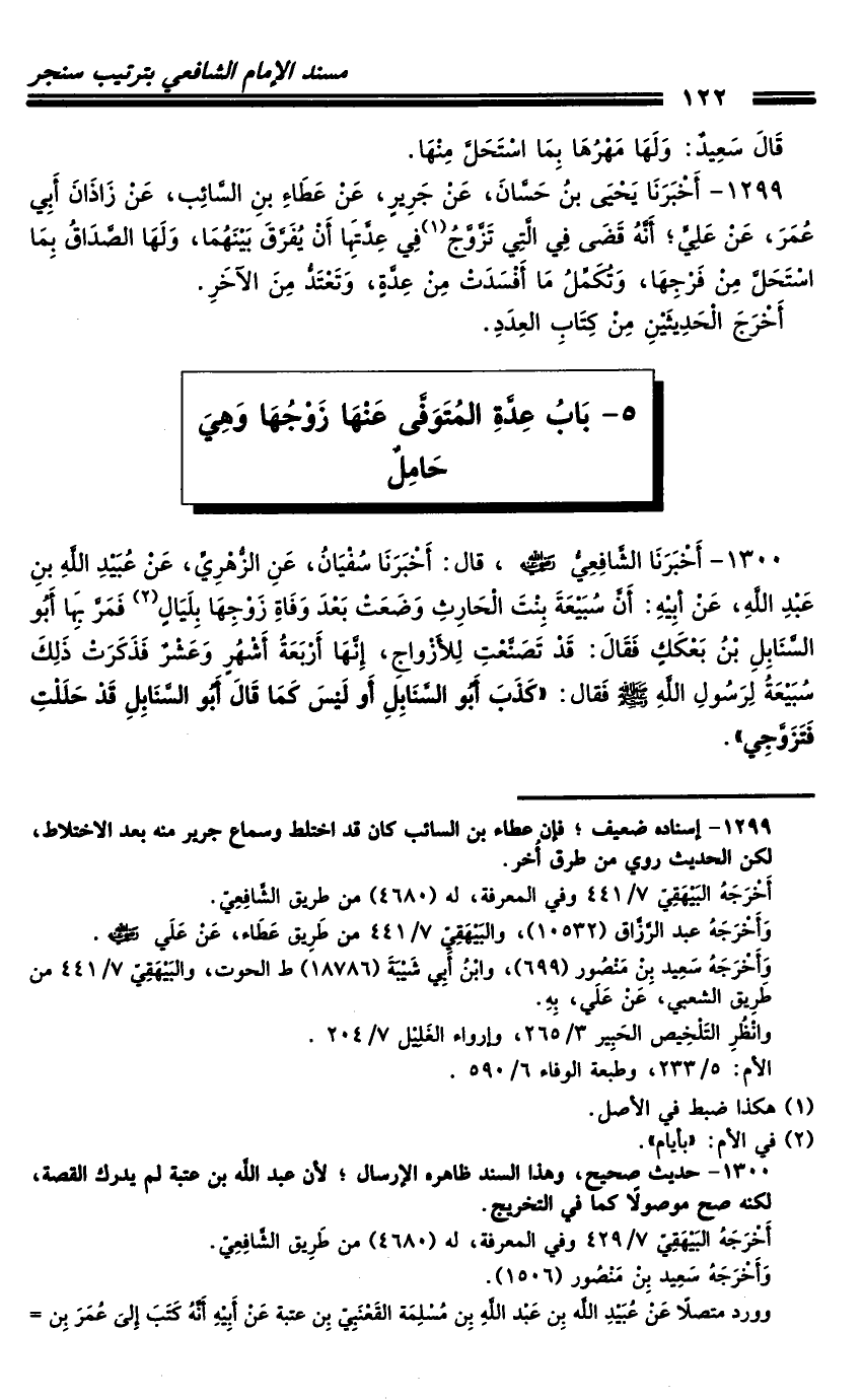 1300 - أَخْبَرَنَا الشَّافِعِيُّ رَضِيَ اللَّهُ عَنْهُ، قَالَ: أَخْبَرَنَا سُفْيَانُ، عَنِ الزُّهْرِيِّ، عَنْ عُبَيْدِ اللَّهِ بْنِ عَبْدِ اللَّهِ، عَنْ أَبِيهِ: أَنَّ سُبَيْعَةَ بِنْتَ الْحَارِثِ وَضَعَتْ بَعْدَ وَفَاةِ زَوْجِهَا بِلَيَالٍ فَمَرَّ بِهَا أَبُو السَّنَابِلِ بْنُ بَعْكَكٍ، فَقَالَ: قَدْ تَصَنَّعْتِ لِلأَزْوَاجِ، إِنَّهَا أَرْبَعَةُ أَشْهُرٍ وَعَشْرٌ، فَذَكَرَتْ ذَلِكَ سُبَيْعَةُ لِرَسُولِ اللَّهِ صَلَّى اللَّهُ عَلَيْهِ وَسَلَّمَ فَقَالَ: «كَذَبَ أَبُو السَّنَابِلِ، أَوْ لَيْسَ كَمَا قَالَ أَبُو السَّنَابِلِ، قَدْ حَلَلْتِ فَتَزَوَّجِي» .