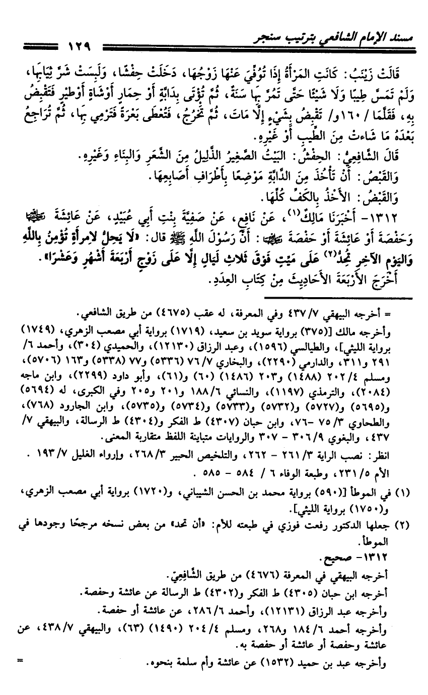 1312 - أَخْبَرَنَا مَالِكٌ، عَنْ نَافِعٍ، عَنْ صَفِيَّةَ بِنْتِ أَبِي عُبَيْدٍ، عَنْ عَائِشَةَ رَضِيَ اللَّهُ عَنْهَا وَحَفْصَةَ، أَوْ عَائِشَةَ أَوْ حَفْصَةَ رَضِيَ اللَّهُ عَنْهُمَا: أَنَّ رَسُولَ اللَّهِ صَلَّى اللَّهُ عَلَيْهِ وَسَلَّمَ قَالَ: «لا يَحِلُّ لامْرَأَةٍ تُؤْمِنُ بِاللَّهِ وَالْيَوْمِ الآخِرِ تُحِدُّ عَلَى مَيِّتٍ فَوْقَ ثَلاثِ لَيَالٍ إِلا عَلَى زَوْجٍ أَرْبَعَةَ أَشْهُرٍ وَعَشْرًا» .