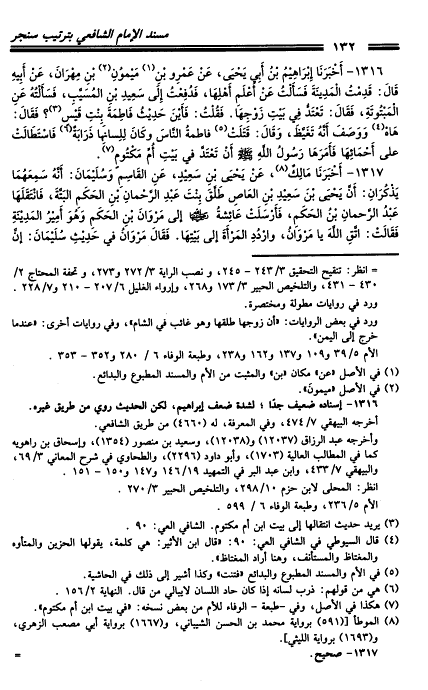 1316 - أَخْبَرَنَا إِبْرَاهِيمُ بْنُ أَبِي يَحْيَى، عَنْ عَمْرِو بْنِ مَيْمُونِ بْنِ مِهْرَانَ، عَنْ أَبِيهِ، قَالَ: قَدِمْتُ الْمَدِينَةَ فَسَأَلْتُ عَنْ أَعْلَمِ أَهْلِهَا، فَدَفَعْتُ إِلَى سَعِيدِ بْنِ الْمُسَيِّبِ، فَسَأَلْتُهُ عَنِ الْمَبْتُوتَةِ، فَقَالَ: تَعْتَدُّ فِي بَيْتِ زَوْجِهَا.
