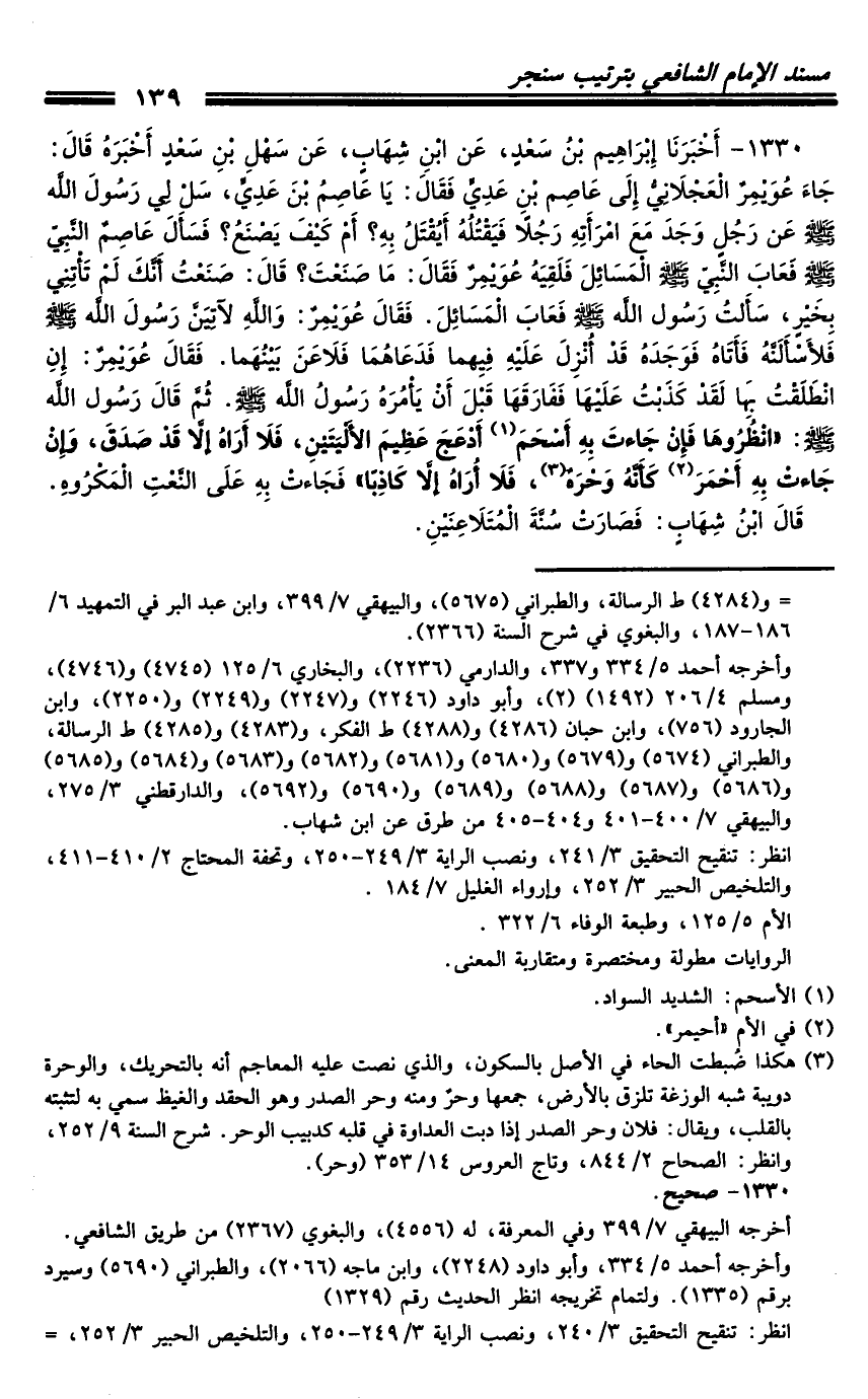 1330 - أَخْبَرَنَا إِبْرَاهِيمُ بْنُ سَعْدٍ، عَنِ ابْنِ شِهَابٍ، عَنْ سَهْلِ بْنِ سَعْدٍ أَخْبَرَهُ، قَالَ: جَاءَ عُوَيْمِرٌ الْعَجْلانِيُّ إِلَى عَاصِمِ بْنِ عَدِيٍّ، فَقَالَ: يَا عَاصِمُ بْنَ عَدِيٍّ: سَلْ لِي رَسُولَ اللَّهِ صَلَّى اللَّهُ عَلَيْهِ وَسَلَّمَ عَنْ رَجُلٍ وَجَدَ مَعَ امْرَأَتِهِ رَجُلا فَيَقْتُلُهُ أَيُقْتَلُ بِهِ؟ أَمْ كَيْفَ يَصْنَعُ؟ فَسَأَلَ عَاصِمٌ النَّبِيَّ صَلَّى اللَّهُ عَلَيْهِ وَسَلَّمَ فَعَابَ النَّبِيُّ صَلَّى اللَّهُ عَلَيْهِ وَسَلَّمَ الْمَسَائِلَ، فَلَقِيَهُ عُوَيْمِرٌ فَقَالَ: مَا صَنَعْتَ؟ قَالَ: صَنَعْتُ أَنَّكَ لَمْ تَأْتِنِي بِخَيْرٍ، سَأَلْتُ رَسُولَ اللَّهِ صَلَّى اللَّهُ عَلَيْهِ وَسَلَّمَ فَعَابَ الْمَسَائِلَ.