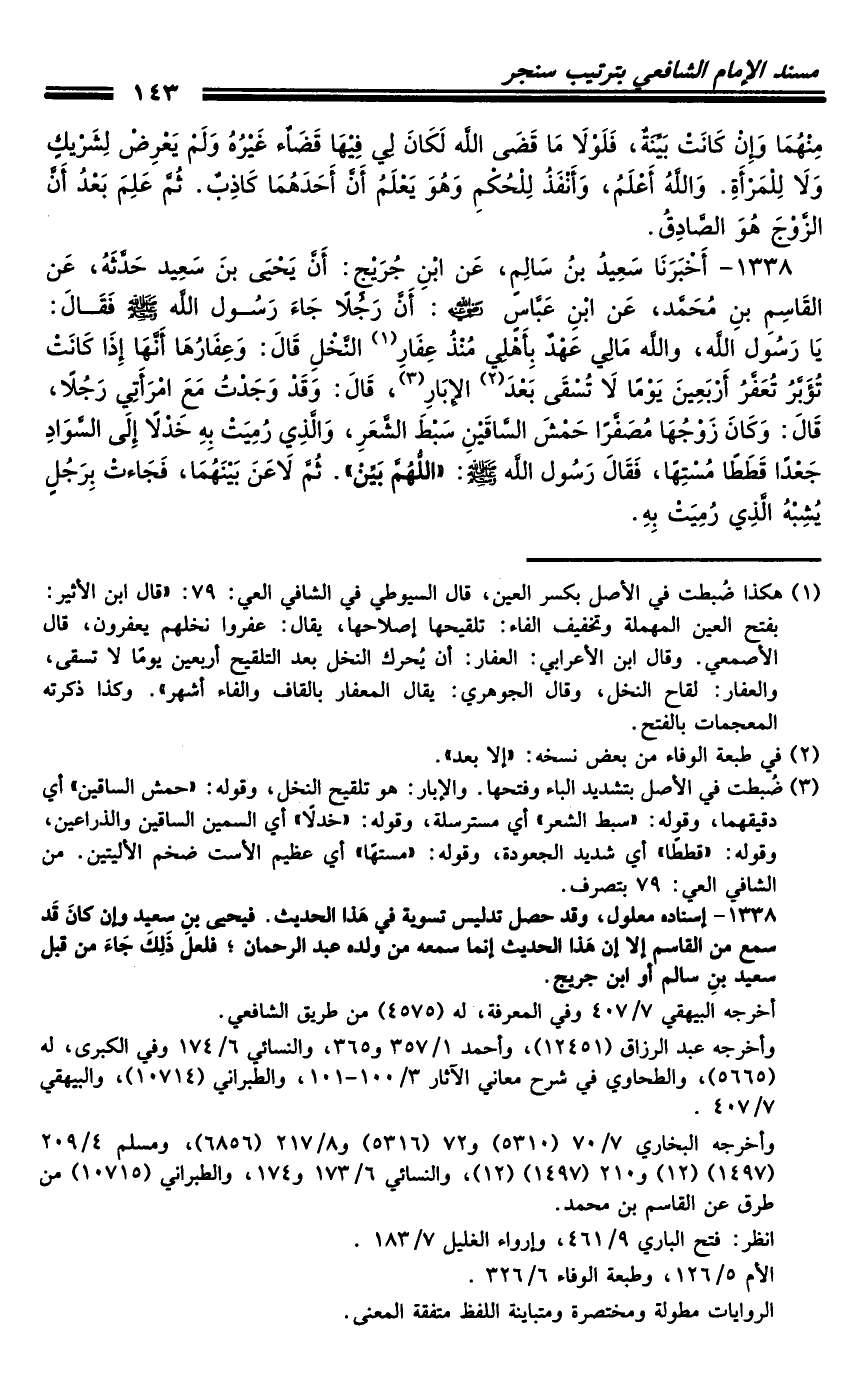 1338 - أَخْبَرَنَا سَعِيدُ بْنُ سَالِمٍ، عَنِ ابْنِ جُرَيْجٍ، أَنَّ يَحْيَى بْنَ سَعِيدٍ حَدَّثَهُ، عَنِ الْقَاسِمِ بْنِ مُحَمَّدٍ، عَنِ ابْنِ عَبَّاسٍ رَضِيَ اللَّهُ عَنْهُ: أَنَّ رَجُلا جَاءَ رَسُولَ اللَّهِ صَلَّى اللَّهُ عَلَيْهِ وَسَلَّمَ فَقَالَ: يَا رَسُولِ اللَّهِ، وَاللَّهِ مَا لِي عَهْدٌ بِأَهْلِي مُنْذُ عِفَارِ النَّخْلِ، قَالَ: وَعِفَارُهَا أَنَّهَا إِذَا كَانَتْ تُؤَبَّرُ أَرْبَعِينَ يَوْمًا لا تُسْقَى بَعْدَ الإِبَارِ، قَالَ: وَقَدْ وَجَدْتُ مَعَ امْرَأَتِي رَجُلا، قَالَ: وَكَانَ زَوْجُهَا مُصَفَّرًا حَمْشَ السَّاقَيْنِ سَبْطَ الشَّعَرِ، وَالَّذِي رُمِيَتْ بِهِ خَدْلا إِلَى السَّوَادِ جَعْدًا قَطَطًا مُسْتَهًا، فَقَالَ رَسُولُ اللَّهِ صَلَّى اللَّهُ عَلَيْهِ وَسَلَّمَ: «اللَّهُمَّ بَيِّنْ» .