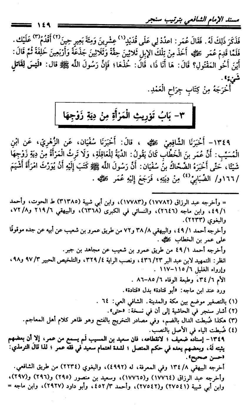 1349 - أَخْبَرَنَا الشَّافِعِيُّ رَضِيَ اللَّهُ عَنْهُ، قَالَ: أَخْبَرَنَا سُفْيَانُ، عَنِ الزُّهْرِيِّ، عَنِ ابْنِ الْمُسَيِّبِ، أَنَّ عُمَرَ بْنَ الْخَطَّابِ كَانَ يَقُولُ: الدِّيَةُ لِلْعَاقِلَةِ، وَلا تَرِثُ الْمَرْأَةُ مِنْ دِيَةِ زَوْجِهَا شَيْئًا، حَتَّى أَخْبَرَهُ الضَّحَّاكُ بْنُ سُفْيَانَ: أَنَّ رَسُولَ اللَّهِ صَلَّى اللَّهُ عَلَيْهِ وَسَلَّمَ كَتَبَ إِلَيْهِ أَنْ يُورِثَ امْرَأَةَ أَشْيَمَ الضِّبَابِيِّ مِنْ دِيَتِهِ، فَرَجَعَ إِلَيْهِ عُمَرُ رَضِيَ اللَّهُ عَنْهُ.