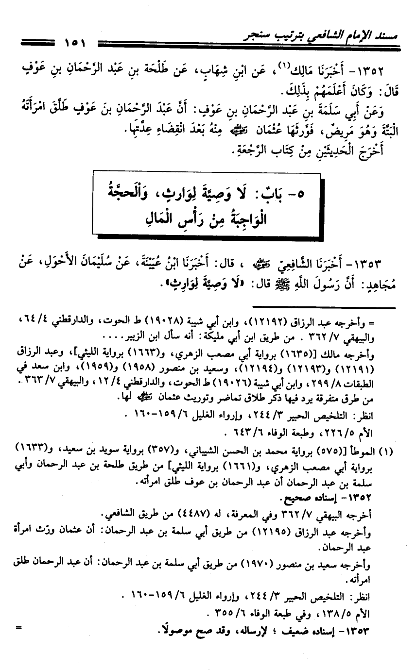 1353 - أَخْبَرَنَا الشَّافِعِيُّ رَضِيَ اللَّهُ عَنْهُ، قَالَ: أَخْبَرَنَا ابْنُ عُيَيْنَةَ، عَنْ سُلَيْمَانَ الأَحْوَلِ، عَنْ مُجَاهِدٍ: أَنَّ رَسُولَ اللَّهِ صَلَّى اللَّهُ عَلَيْهِ وَسَلَّمَ قَالَ: «لا وَصِيَّةَ لِوَارِثٍ» .