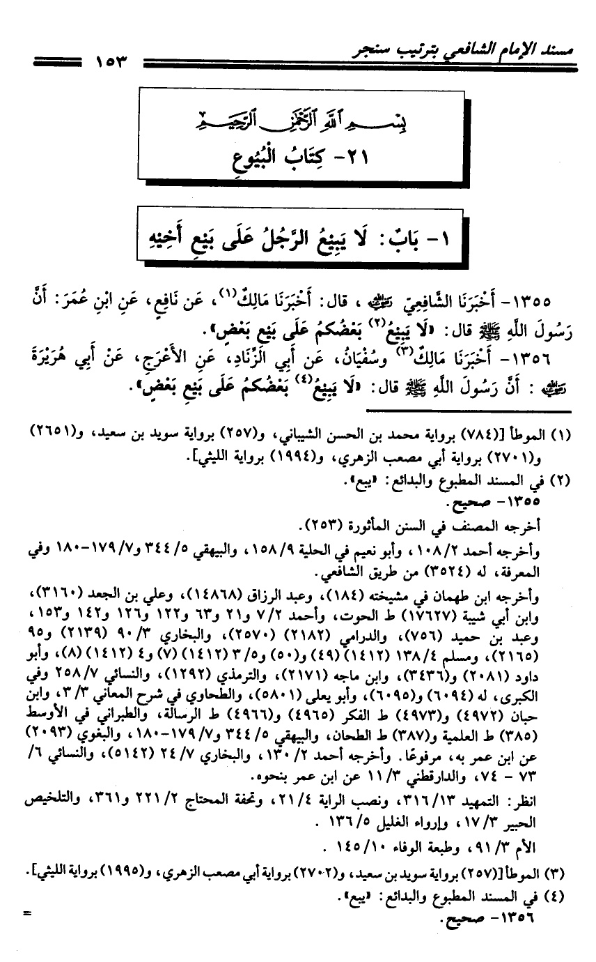 1355 - أَخْبَرَنَا الشَّافِعِيُّ رَضِيَ اللَّهُ عَنْهُ، قَالَ: أَخْبَرَنَا مَالِكٌ، عَنْ نَافِعٍ، عَنِ ابْنِ عُمَرَ: أَنَّ رَسُولَ اللَّهِ صَلَّى اللَّهُ عَلَيْهِ وَسَلَّمَ قَالَ: «لا يَبِيعُ بَعْضُكُمْ عَلَى بَيْعِ بَعْضٍ» .