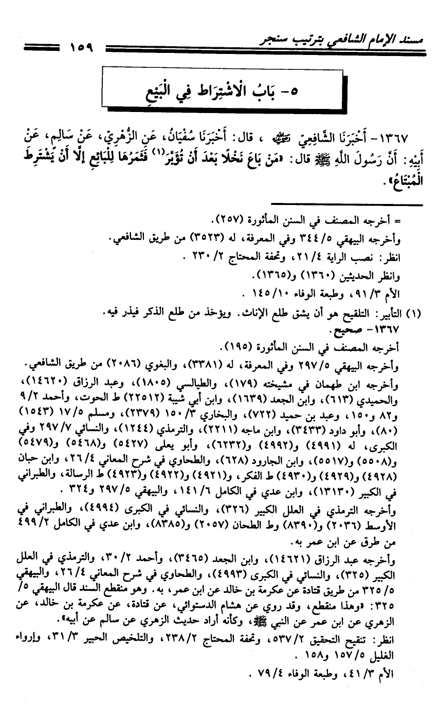 1367 - أَخْبَرَنَا الشَّافِعِيُّ رَضِيَ اللَّهُ عَنْهُ، قَالَ: أَخْبَرَنَا سُفْيَانُ، عَنِ الزُّهْرِيِّ، عَنْ سَالِمٍ، عَنْ أَبِيهِ: أَنَّ رَسُولَ اللَّهِ صَلَّى اللَّهُ عَلَيْهِ وَسَلَّمَ قَالَ: «مَنْ بَاعَ نَخْلا بَعْدَ أَنْ تُؤَبَّرَ فَثَمَرُهَا لِلْبَائِعِ إِلا أَنْ يَشْتَرِطَ الْمُبْتَاعُ» .