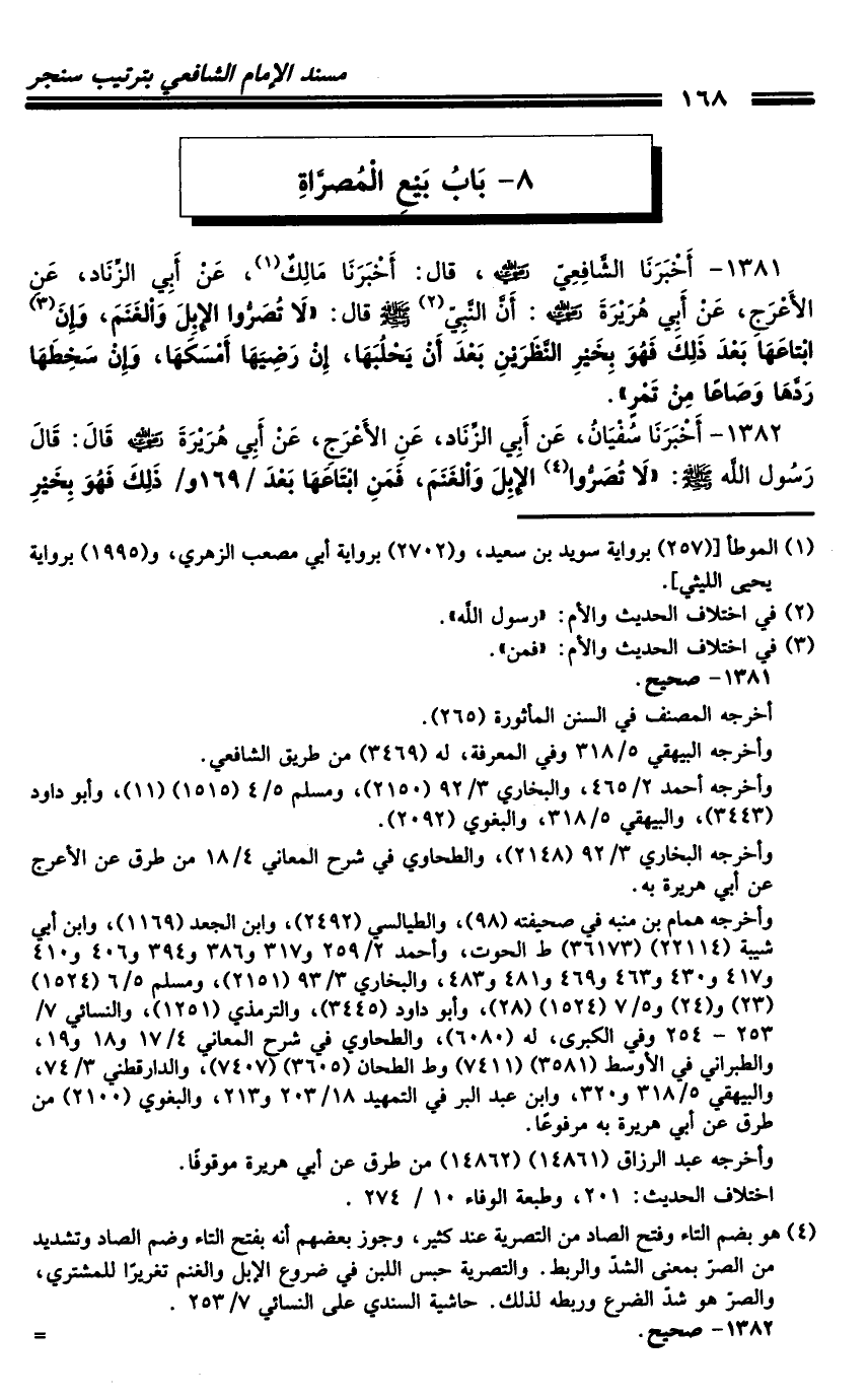 1381 - أَخْبَرَنَا الشَّافِعِيُّ رَضِيَ اللَّهُ عَنْهُ، قَالَ: أَخْبَرَنَا مَالِكٌ، عَنْ أَبِي الزِّنَادِ، عَنِ الأَعْرَجِ، عَنْ أَبِي هُرَيْرَةَ رَضِيَ اللَّهُ عَنْهُ: أَنَّ النَّبِيَّ صَلَّى اللَّهُ عَلَيْهِ وَسَلَّمَ قَالَ: «لا تُصَرُّوا الإِبِلَ وَالْغَنَمَ، وَإِنِ ابْتَاعَهَا بَعْدَ ذَلِكَ فَهُوَ بِخَيْرِ النَّظَرَيْنِ بَعْدَ أَنْ يَحْلُبَهَا، إِنْ رَضِيَهَا أَمْسَكَهَا، وَإِنْ سَخِطَهَا رَدَّهَا وَصَاعًا مِنْ تَمْرٍ» .