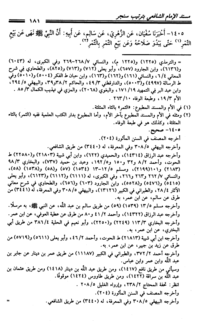 1405 - أَخْبَرَنَا سُفْيَانُ، عَنِ الزُّهْرِيِّ، عَنْ سَالِمٍ، عَنْ أَبِيهِ: أَنَّ النَّبِيَّ صَلَّى اللَّهُ عَلَيْهِ وَسَلَّمَ نَهَى عَنْ بَيْعِ التَّمْرِ حَتَّى يَبْدُوَ صَلاحُهُ وَعَنْ بَيْعِ التَّمْرِ بِالتَّمْرِ.