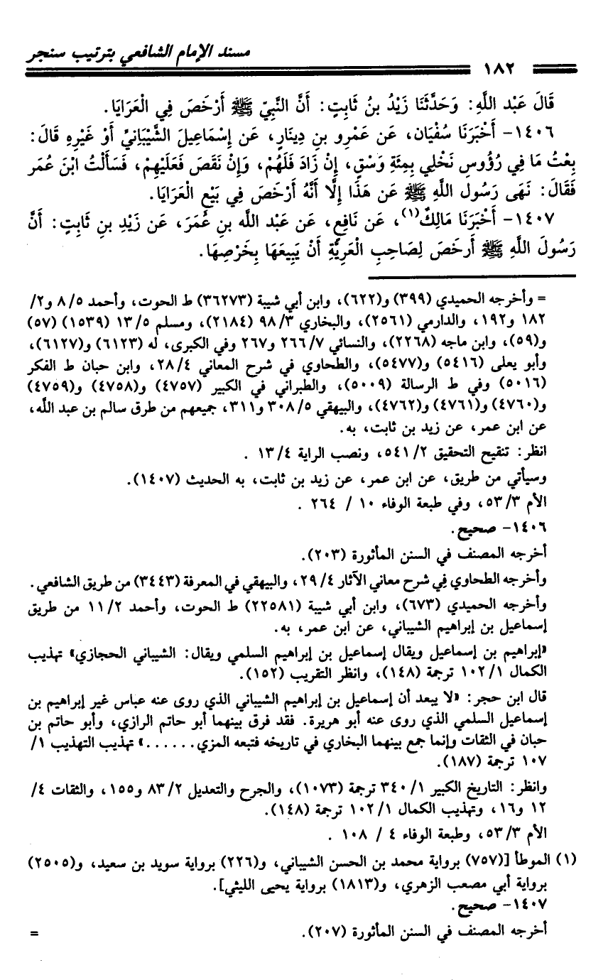 1407 - أَخْبَرَنَا مَالِكٌ، عَنْ نَافِعٍ، عَنْ عَبْدِ اللَّهِ بْنِ عُمَرَ، عَنْ زَيْدِ بْنِ ثَابِتٍ: أَنَّ رَسُولَ اللَّهِ صَلَّى اللَّهُ عَلَيْهِ وَسَلَّمَ أَرْخَصَ لِصَاحِبِ الْعَرِيَّةِ أَنْ يَبِيعَهَا بِخَرْصِهَا.