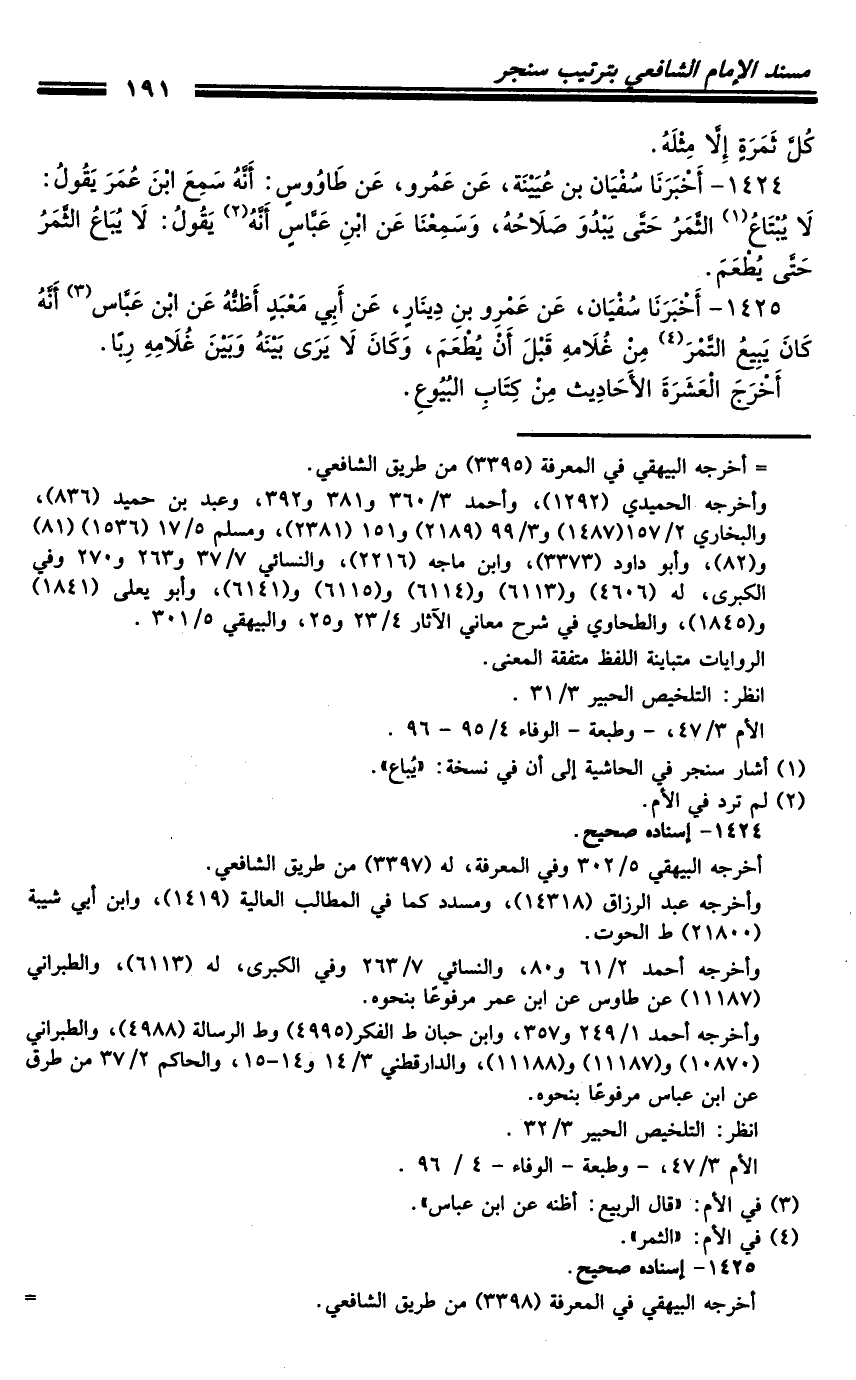 1424 - أَخْبَرَنَا سُفْيَانُ بْنُ عُيَيْنَةَ، عَنْ عَمْرٍو، عَنْ طَاوُسٍ: أَنَّهُ سَمِعَ ابْنَ عُمَرَ يَقُولُ: لا يُبْتَاعُ الثَّمَرُ حَتَّى يَبْدُوَ صَلاحُهُ، وَسَمِعْنَا عَنِ ابْنِ عَبَّاسٍ أَنَّهُ يَقُولُ: لا يُبَاعُ الثَّمَرُ حَتَّى يُطْعَمَ.