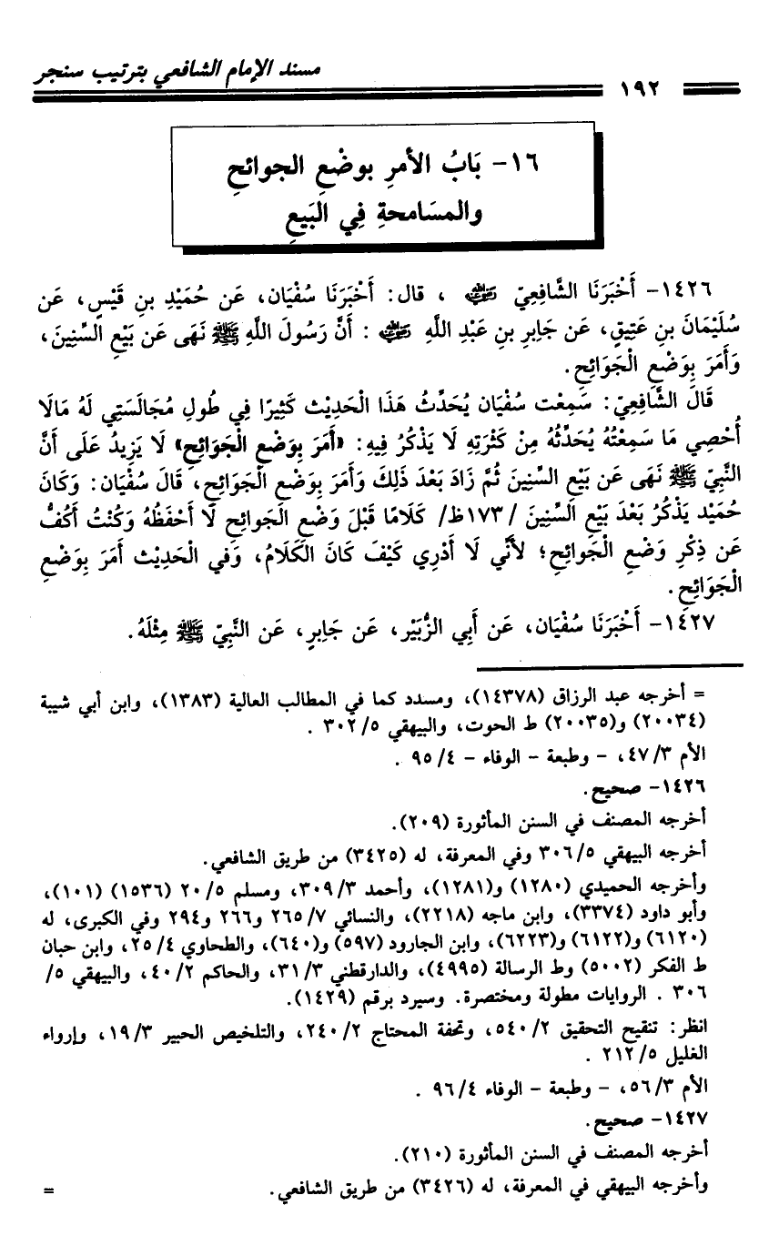 1426 - أَخْبَرَنَا الشَّافِعِيُّ رَضِيَ اللَّهُ عَنْهُ، قَالَ: أَخْبَرَنَا سُفْيَانُ، عَنْ حُمَيْدِ بْنِ قَيْسٍ، عَنْ سُلَيْمَانَ بْنِ عَتِيقٍ، عَنْ جَابِرِ بْنِ عَبْدِ اللَّهِ رَضِيَ اللَّهُ عَنْهُ: أَنَّ رَسُولَ اللَّهِ صَلَّى اللَّهُ عَلَيْهِ وَسَلَّمَ نَهَى عَنْ بَيْعِ السِّنِينَ، وَأَمَرَ بِوَضْعِ الْجَوَائِحِ.