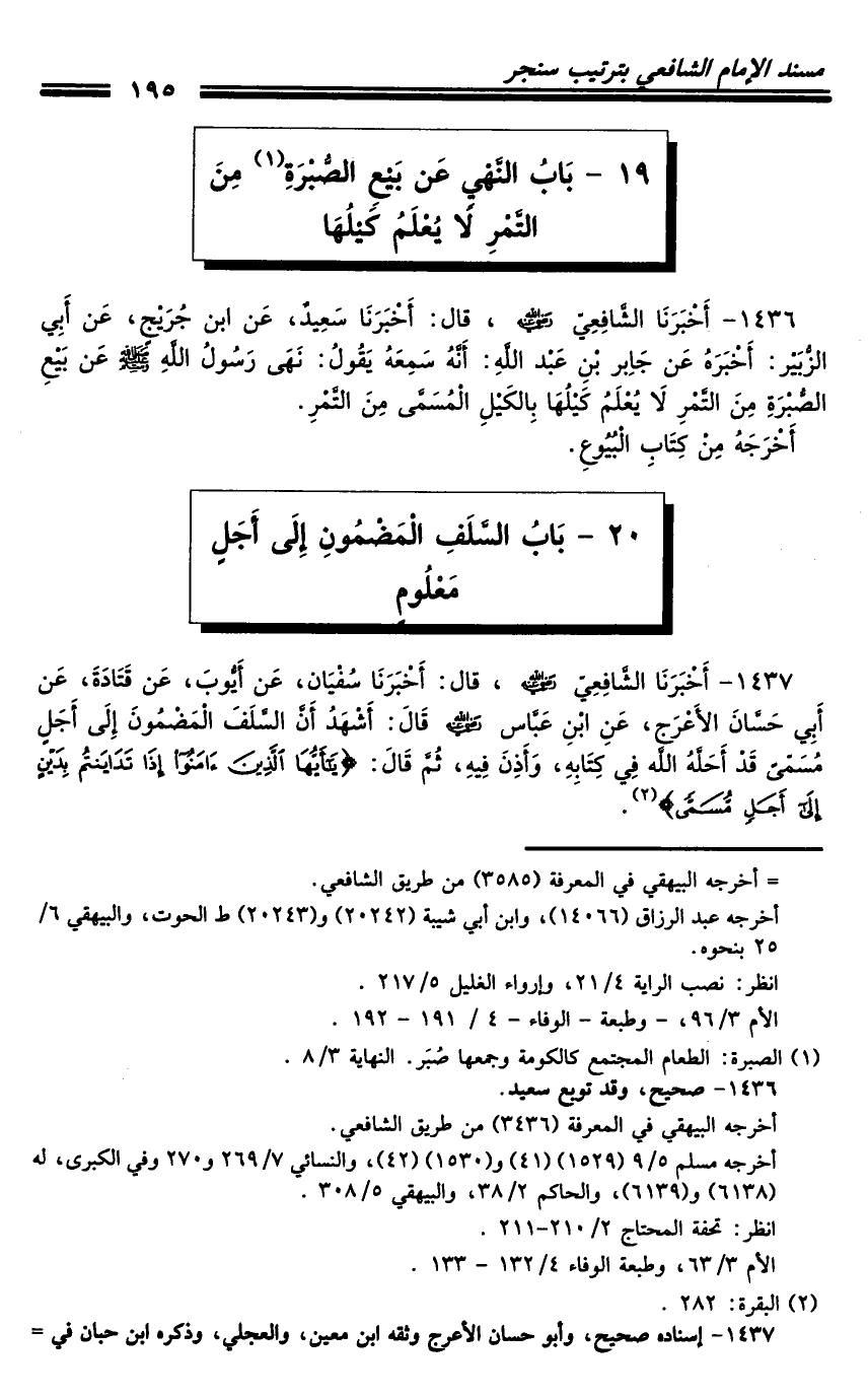 1436 - أَخْبَرَنَا الشَّافِعِيُّ رَضِيَ اللَّهُ عَنْهُ، قَالَ: أَخْبَرَنَا سَعِيدٌ، عَنِ ابْنِ جُرَيْجٍ، عَنْ أَبِي الزُّبَيْرِ أَخْبَرَهُ، عَنْ جَابِرِ بْنِ عَبْدِ اللَّهِ: أَنَّهُ سَمِعَهُ يَقُولُ: نَهَى رَسُولُ اللَّهِ صَلَّى اللَّهُ عَلَيْهِ وَسَلَّمَ عَنْ بَيْعِ الصُّبْرَةِ مِنَ التَّمْرِ لا يُعْلَمُ كَيْلُهَا بِالْكَيْلِ الْمُسَمَّى مِنَ التَّمْرِ.