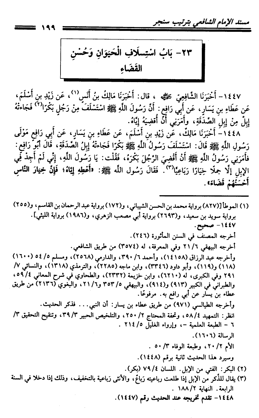 1447 - أَخْبَرَنَا الشَّافِعِيُّ رَضِيَ اللَّهُ عَنْهُ، قَالَ: أَخْبَرَنَا مَالِكُ بْنُ أَنَسٍ، عَنْ زَيْدِ بْنِ أَسْلَمَ، عَنْ عَطَاءِ بْنِ يَسَارٍ، عَنْ أَبِي رَافِعٍ: أَنَّ رَسُولَ اللَّهِ صَلَّى اللَّهُ عَلَيْهِ وَسَلَّمَ اسْتَسْلَفَ مِنْ رَجُلٍ بَكْرًا فَجَاءَتْهُ إِبِلٌ مِنْ إِبِلِ الصَّدَقَةِ، وَأَمَرَنِي أَنْ أُقْضِيَهُ إِيَّاهُ.