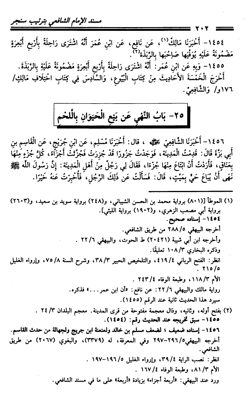 1456 - أَخْبَرَنَا الشَّافِعِيُّ رَضِيَ اللَّهُ عَنْهُ، قَالَ: أَخْبَرَنَا مُسْلِمٌ، عَنِ ابْنِ جُرَيْجٍ، عَنِ الْقَاسِمِ بْنِ أَبِي بَزَّةَ، قَالَ: قَدِمْتُ الْمَدِينَةَ، فَوَجَدْتُ جَزُورًا قَدْ جُزِرَتْ فَجُزِّئَتْ أَجْزَاءً، كُلُّ جُزْءٍ مِنْهَا بِعَنَاقٍ، فَأَرَدْتُ أَنْ أَبْتَاعَ مِنْهَا جُزْءًا، فَقَالَ لِي رَجُلٌ مِنْ أَهْلِ الْمَدِينَةِ: إِنَّ رَسُولَ اللَّهِ صَلَّى اللَّهُ عَلَيْهِ وَسَلَّمَ نَهَى أَنْ يُبَاعَ حَيٌّ بِمَيِّتٍ، قَالَ: فَسَأَلْتُ عَنْ ذَلِكَ الرَّجُلِ، فَأُخْبِرْتُ عَنْهُ خَيْرًا.