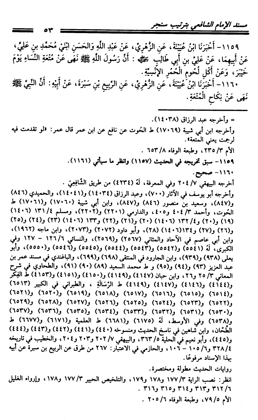 1159 - أَخْبَرَنَا ابْنُ عُيَيْنَةَ، عَنِ الزُّهْرِيِّ، عَنْ عَبْدِ اللَّهِ، وَالْحَسَنِ ابْنَيْ مُحَمَّدِ بْنِ عَلِيٍّ، عَنْ أَبِيهِمَا، عَنْ عَلِيِّ بْنِ أَبِي طَالِبٍ رَضِيَ اللَّهُ عَنْهُ: أَنَّ رَسُولَ اللَّهِ صَلَّى اللَّهُ عَلَيْهِ وَسَلَّمَ نَهَى عَنْ مُتْعَةِ النِّسَاءِ يَوْمَ خَيْبَرَ، وَعَنْ أَكْلِ لُحُومِ الْحُمُرِ الإِنْسِيَّةِ.