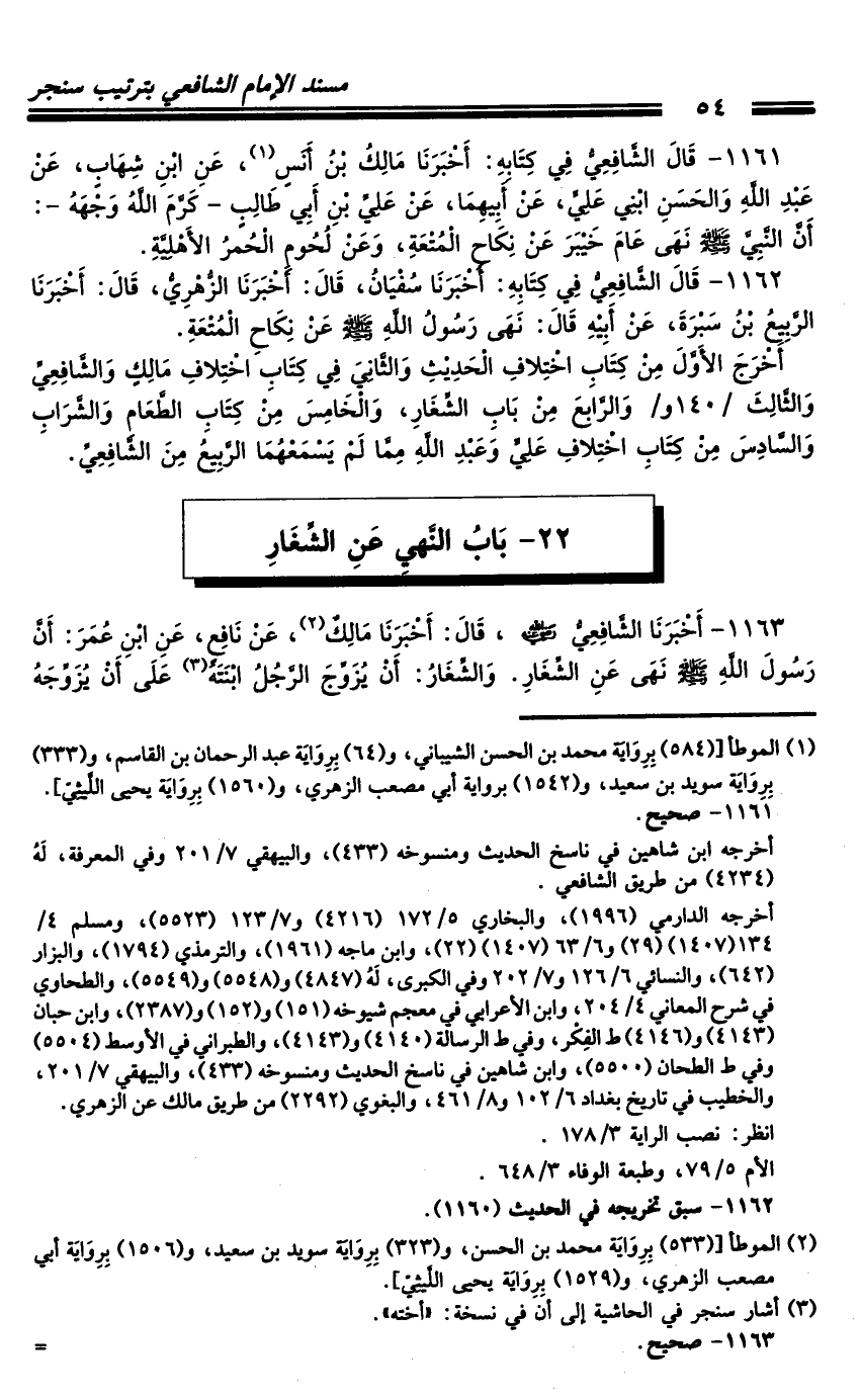 1163 - أَخْبَرَنَا الشَّافِعِيُّ رَضِيَ اللَّهُ عَنْهُ، قَالَ: أَخْبَرَنَا مَالِكٌ، عَنْ نَافِعٍ، عَنِ ابْنِ عُمَرَ: أَنَّ رَسُولَ اللَّهِ صَلَّى اللَّهُ عَلَيْهِ وَسَلَّمَ نَهَى عَنِ الشِّغَارِ.