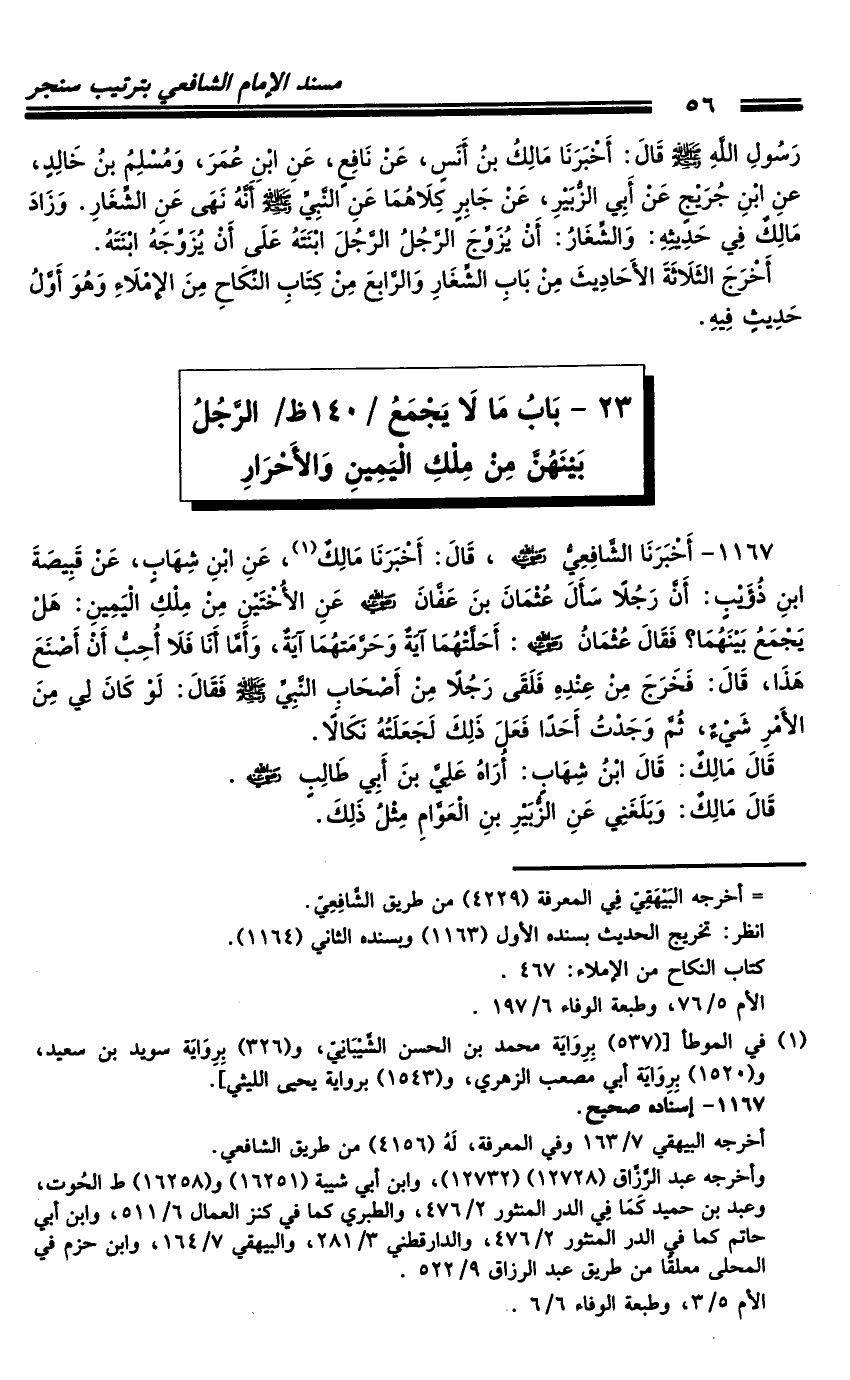 1167 - أَخْبَرَنَا الشَّافِعِيُّ رَضِيَ اللَّهُ عَنْهُ، قَالَ: أَخْبَرَنَا مَالِكٌ، عَنِ ابْنِ شِهَابٍ، عَنْ قَبِيصَةَ بْنِ ذُؤَيْبٍ: أَنَّ رَجُلا سَأَلَ عُثْمَانَ بْنَ عَفَّانَ رَضِيَ اللَّهُ عَنْهُ عَنِ الأُخْتَيْنِ مِنْ مِلْكِ الْيَمِينِ: هَلْ يَجْمَعُ بَيْنَهُمَا؟ فَقَالَ عُثْمَانُ رَضِيَ اللَّهُ عَنْهُ: أَحَلَّتْهُمَا آيَةٌ وَحَرَّمَتْهُمَا آيَةٌ، وَأَمَّا أَنَا فَلا أُحِبُّ أَنْ أَصْنَعَ هَذَا، قَالَ: فَخَرَجَ مِنْ عِنْدَهُ فَلَقِيَ رَجُلا مِنْ أَصْحَابِ النَّبِيِّ صَلَّى اللَّهُ عَلَيْهِ وَسَلَّمَ فَقَالَ: لَوْ كَانَ لِي مِنَ الأَمْرِ شَيْءٌ، ثُمَّ وَجَدْتُ أَحَدًا فَعَلَ ذَلِكَ لَجَعَلْتُهُ نَكَالا.
