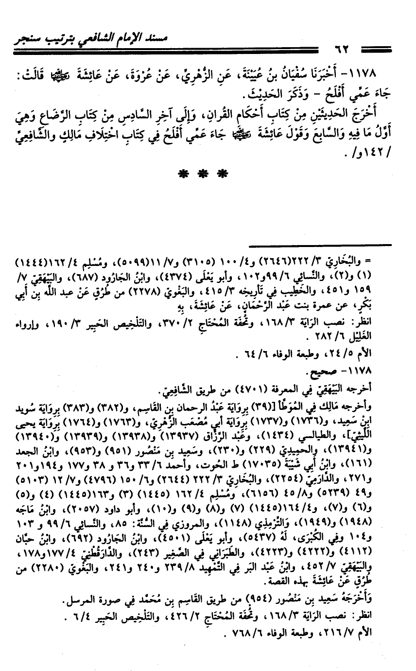 1178 - أَخْبَرَنَا سُفْيَانُ بْنُ عُيَيْنَةَ، عَنِ الزُّهْرِيِّ، عَنْ عُرْوَةَ، عَنْ عَائِشَةَ رَضِيَ اللَّهُ عَنْهَا قَالَتْ: جَاءَ عَمِّي أَفْلَحُ، وَذَكَرَ الْحَدِيثَ.