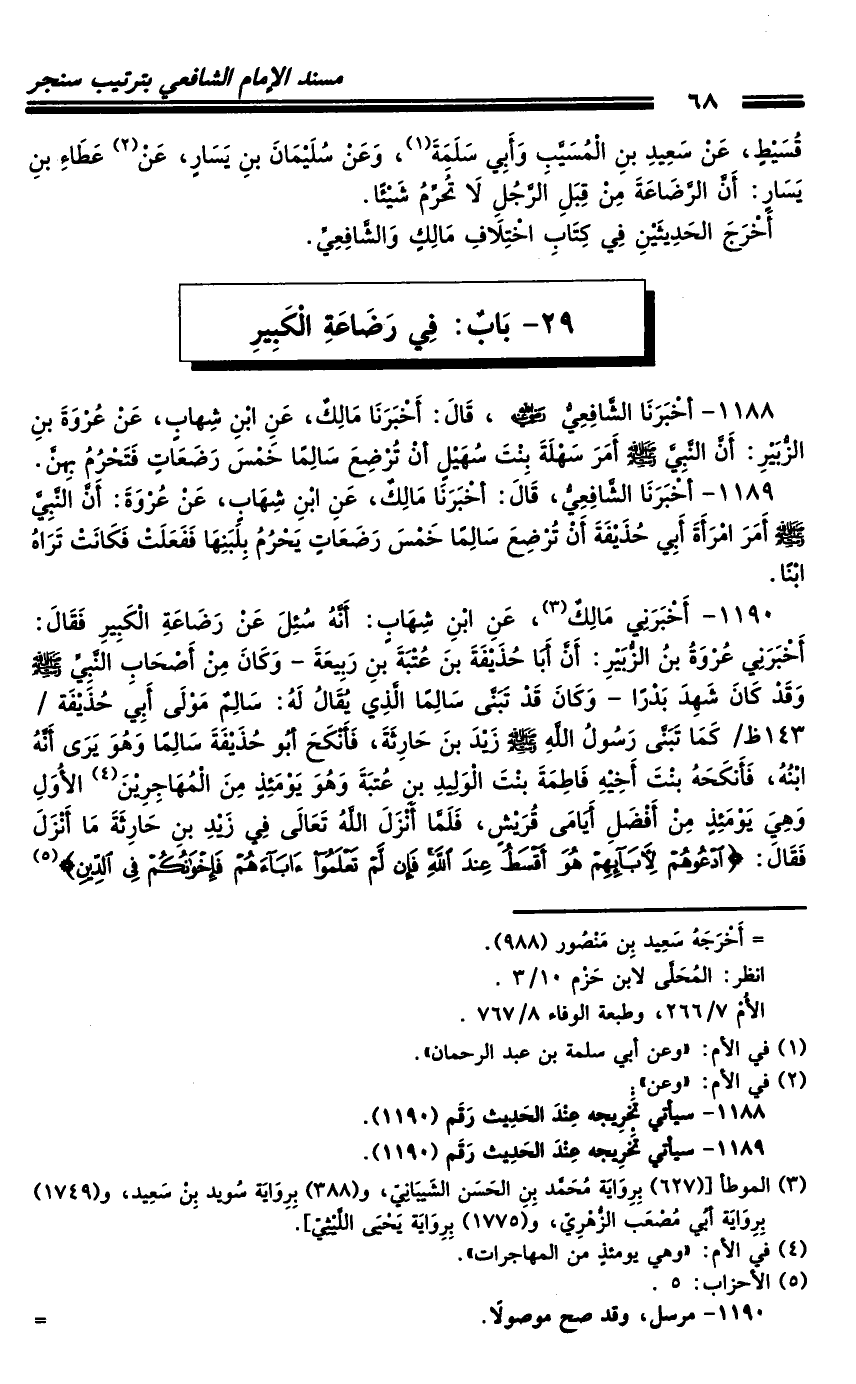 1189 - أَخْبَرَنَا الشَّافِعِيُّ، قَالَ: أَخْبَرَنَا مَالِكٌ، عَنِ ابْنِ شِهَابٍ، عَنْ عُرْوَةَ: أَنَّ النَّبِيَّ صَلَّى اللَّهُ عَلَيْهِ وَسَلَّمَ أَمَرَ امْرَأَةَ أَبِي حُذَيْفَةَ أَنْ تُرْضِعَ سَالِمًا خَمْسَ رَضَعَاتٍ يَحْرُمُ بِلَبَنِهَا فَفَعَلَتْ فَكَانَتْ تَرَاهُ ابْنًا.