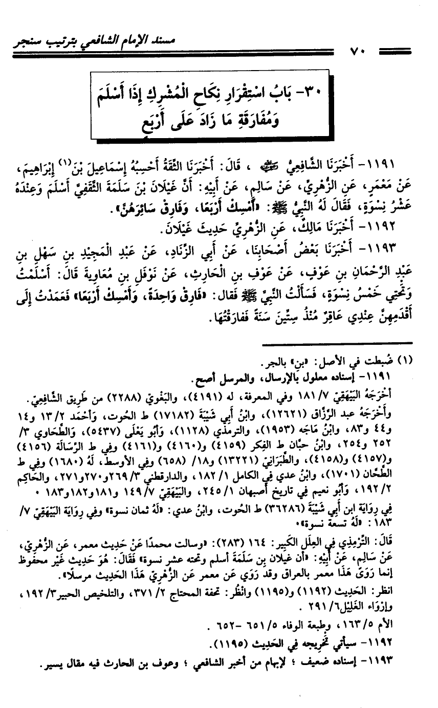 1191 - أَخْبَرَنَا الشَّافِعِيُّ رَضِيَ اللَّهُ عَنْهُ، قَالَ: أَخْبَرَنَا الثِّقَةُ أَحْسَبُهُ إِسْمَاعِيلَ بْنَ إِبْرَاهِيمَ، عَنْ مَعْمَرٍ، عَنِ الزُّهْرِيِّ، عَنْ سَالِمٍ، عَنْ أَبِيهِ: أَنَّ غَيْلانَ بْنَ سَلَمَةَ الثَّقَفِيَّ أَسْلَمَ وَعِنْدَهُ عَشْرُ نِسْوَةٍ، فَقَالَ لَهُ النَّبِيُّ صَلَّى اللَّهُ عَلَيْهِ وَسَلَّمَ: «أَمْسِكْ أَرْبَعًا، وَفَارِقْ سَائِرَهُنَّ» .