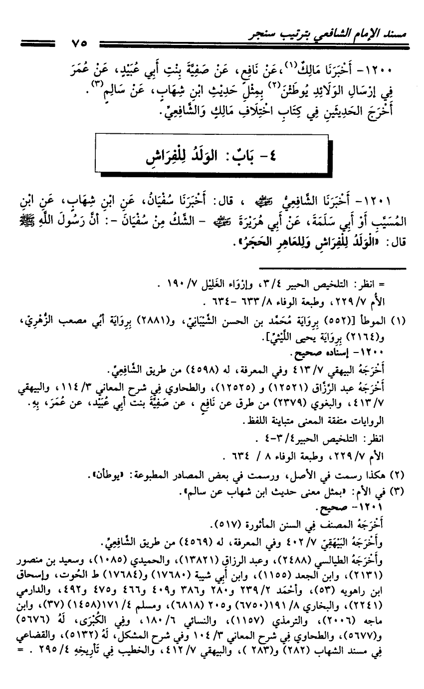 1201 - أَخْبَرَنَا الشَّافِعِيُّ رَضِيَ اللَّهُ عَنْهُ، قَالَ: أَخْبَرَنَا سُفْيَانُ، عَنِ ابْنِ شِهَابٍ، عَنِ ابْنِ الْمُسَيِّبِ أَوْ أَبِي سَلَمَةَ، عَنْ أَبِي هُرَيْرَةَ رَضِيَ اللَّهُ عَنْهُ، الشَّكُّ مِنْ سُفْيَانَ: أَنَّ رَسُولَ اللَّهِ صَلَّى اللَّهُ عَلَيْهِ وَسَلَّمَ قَالَ: «الْوَلَدُ لِلْفِرَاشِ وَلِلْعَاهِرِ الْحَجَرُ» .