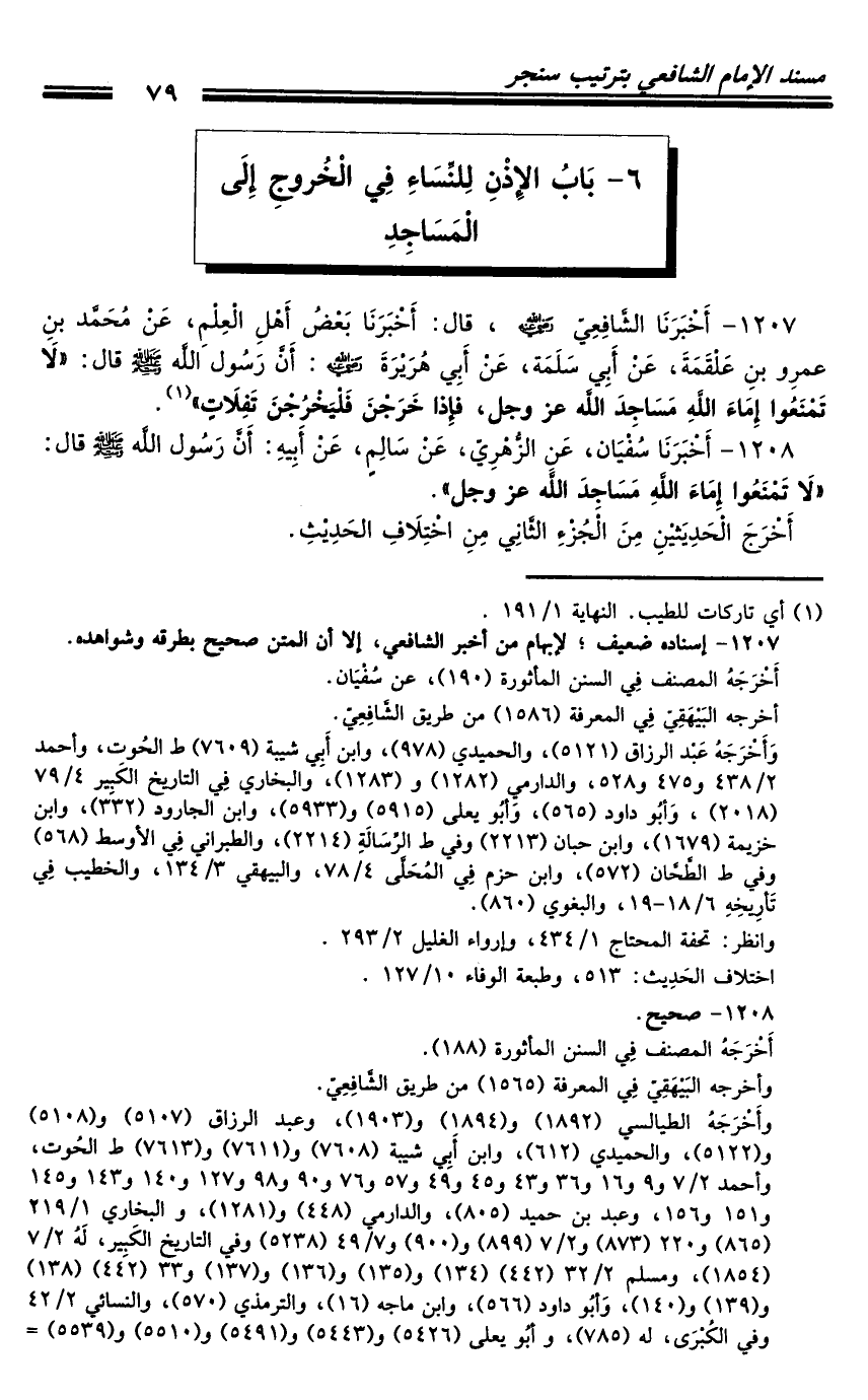 1208 - أَخْبَرَنَا سُفْيَانُ، عَنِ الزُّهْرِيِّ، عَنْ سَالِمٍ، عَنْ أَبِيهِ: أَنَّ رَسُولَ اللَّهِ صَلَّى اللَّهُ عَلَيْهِ وَسَلَّمَ قَالَ: «لا تَمْنَعُوا إِمَاءَ اللَّهِ مَسَاجِدَ اللَّهِ عَزَّ وَجَلَّ» .