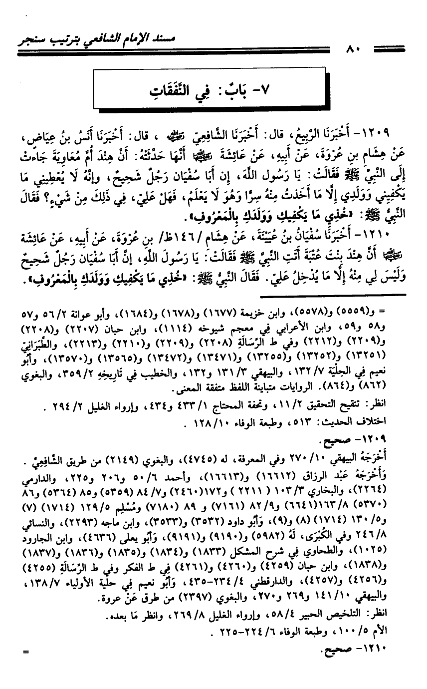 1209 - أَخْبَرَنَا الرَّبِيعُ، قَالَ: أَخْبَرَنَا الشَّافِعِيُّ رَضِيَ اللَّهُ عَنْهُ، قَالَ: أَخْبَرَنَا أَنَسُ بْنُ عِيَاضٍ، عَنْ هِشَامِ بْنِ عُرْوَةَ، عَنْ أَبِيهِ، عَنْ عَائِشَةَ رَضِيَ اللَّهُ عَنْهَا أَنَّهَا حَدَّثَتْهُ: أَنَّ هِنْدَ أُمَّ مُعَاوِيَةَ جَاءَتْ إِلَى النَّبِيِّ صَلَّى اللَّهُ عَلَيْهِ وَسَلَّمَ فَقَالَتْ: يَا رَسُولَ اللَّهِ، إِنَّ أَبَا سُفْيَانَ رَجُلٌ شَحِيحٌ، وَإِنَّهُ لا يُعْطِينِي مَا يَكْفِينِي وَوَلَدِي إِلا مَا أَخَذْتُ مِنْهُ سِرًّا وَهُوَ لا يَعْلَمُ، فَهَلْ عَلَيَّ فِي ذَلِكَ مِنْ شَيْءٍ؟ فَقَالَ النَّبِيُّ صَلَّى اللَّهُ عَلَيْهِ وَسَلَّمَ: «خُذِي مَا يَكْفِيكِ وَوَلَدَكِ بِالْمَعْرُوفِ» .