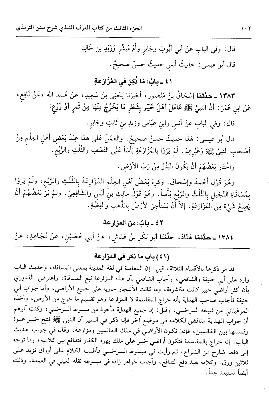 [1383] قد مر ذكرها بالأقسام الثلاثة، قيل: إن المعاملة في لغة المدينة بمعنى المساقاة، وحديث الباب وارد على أبي حنيفة والشافعي، وأجاب الشافعي بأن هذه المزارعة تبع المساقاة، واعترض القدوري بأن أكثر أراضي خيبر كانت مكشوفة، وما كانت الأشجار حاوية على جميع الأراضي، وأما جواب أبي حنيفة فأجاب صاحب الهداية بأنه خراج المقاسمة لا المزارعة وهو تقسيم ما خرج من الأرض، وأخذه المرغيناني عن شيخه السرخسي، وقيل: إن جميع الهداية مأخوذ من مبسوط السرخسي، وكنت أتوهم أن جواب الهداية مناقض لكلامه في موضع آخر فإنه ذكر في السير أن النبي - صَلَّى اللهُ عَلَيْهِ وَسَلَّمَ - فتح خيبر عنوة وقسمها بين الغانمين، فإذن تكون الأراضي في ملك الغانمين ومزارعة، وقال في جواب حديث الباب: إنه خراج بالمقاسمة فتكون أراضي خيبر على ملك يهود الكفار فتدافع بين كلاميه، وما توجه إلى دفعه شارح من الشراح، ثم رأيت في مبسوط السرخسي فأطنب الكلام على أوراق تزيد على ثلاثين ورق. وكلامه يفيد دفع التدافع، وأجاب خواهر زاده في مبسوطه نقله العيني في العمدة، وذلك أيضاً مستبعد جداً.