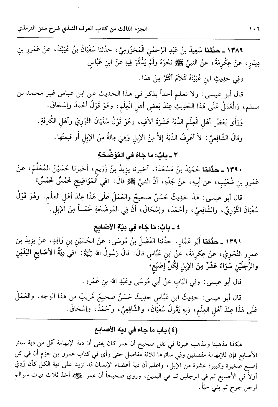 [1391] هكذا مذهبنا ومذهب غيرنا في نقل صحيح أن عمر كان يفتي أن دية الإبهامة أقل من دية سائر الأصابع فإن للإبهامة مفصلين وفي سائرها ثلاثة مفاصل حتى رأى في كتاب عمرو بن حزم أن في كل إصبع صغيرة وكبيرة عشرة من الإبل، واعلم أن دية أعضاء الإنسان قد تزيد على دية الكل كأن وُدِيَ أولاً في الأصابع ثم في الرجلين ثم في اليدين، وروي صحيحاً أن عمر أخذ ثلاث ديات سوالم لرجل جرح ثم بقي حيّاً.