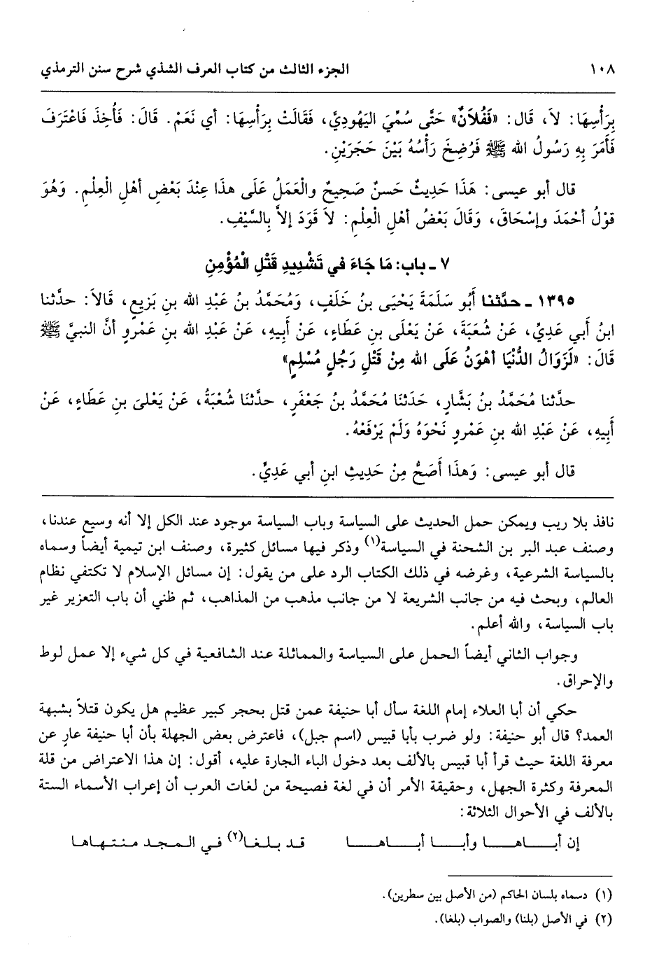 حكي أن أبا العلاء إمام اللغة سأل أبا حنيفة عمن قتل بحجر كبير عظيم هل يكون قتلاً بشبهة العمد؟ قال أبو حنيفة: ولو ضرب بأبا قبيس (اسم جبل) ، فاعترض بعض الجهلة بأن أبا حنيفة عارٍ عن معرفة اللغة حيث قرأ أبا قبيس بالألف بعد دخول الباء الجارة عليه، أقول: إن هذا الاعتراض من قلة المعرفة وكثرة الجهل، وحقيقة الأمر أن في لغة فصيحة من لغات العرب أن إعراب الأسماء الستة بالألف في الأحوال الثلاثة: