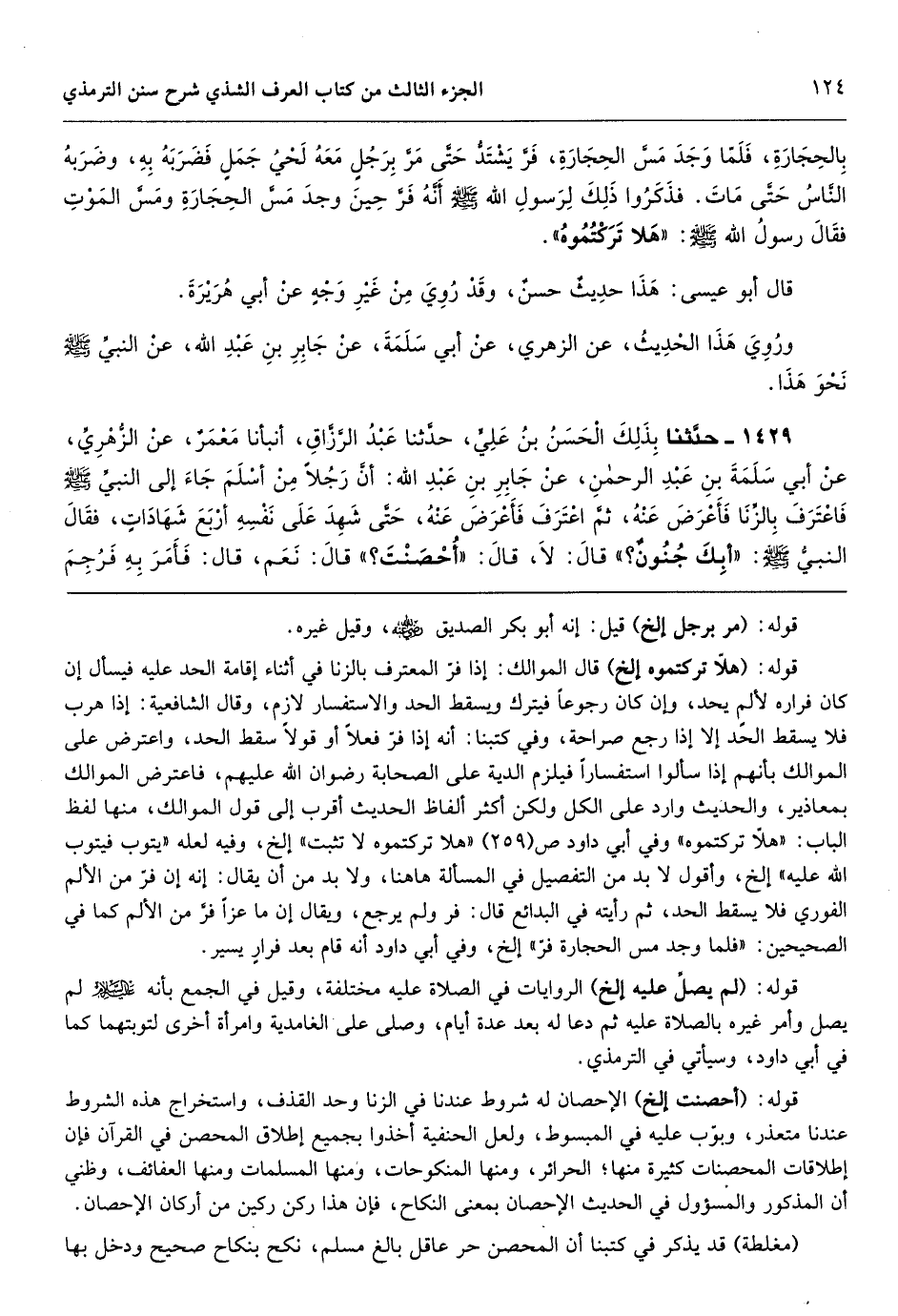 قوله: (هلاّ تركتموه إلخ) قال الموالك: إذا فرّ المعترف بالزنا في أثناء إقامة الحد عليه فيسأل إن كان فراره لألمٍ يحد، وإن كان رجوعاً فيترك ويسقط الحد والاستفسار لازم، وقال الشافعية: إذا هرب فلا يسقط الحد إلا إذا رجع صراحة، وفي كتبنا: أنه إذا فرّ فعلاً أو قولاً سقط الحد، واعترض على الموالك بأنهم إذا سألوا استفساراً فيلزم الدية على الصحابة رضوان الله عليهم، فاعترض الموالك بمعاذير، والحديث وارد على الكل ولكن أكثر ألفاظ الحديث أقرب إلى قول الموالك، منها لفظ الباب: «هلاّ تركتموه» وفي أبي داود ص (259) «هلا تركتموه لا تثبت» إلخ، وفيه لعله «يتوب فيتوب الله عليه» إلخ، وأقول لا بد من التفصيل في المسألة هاهنا، ولا بد من أن يقال: إنه إن فرّ من الألم الفوري فلا يسقط الحد، ثم رأيته في البدائع قال: فر ولم يرجع، ويقال إن ما عزاً فرَّ من الألم كما في الصحيحين: «فلما وجد مس الحجارة فرّ» إلخ، وفي أبي داود أنه قام بعد فرارٍ يسير.