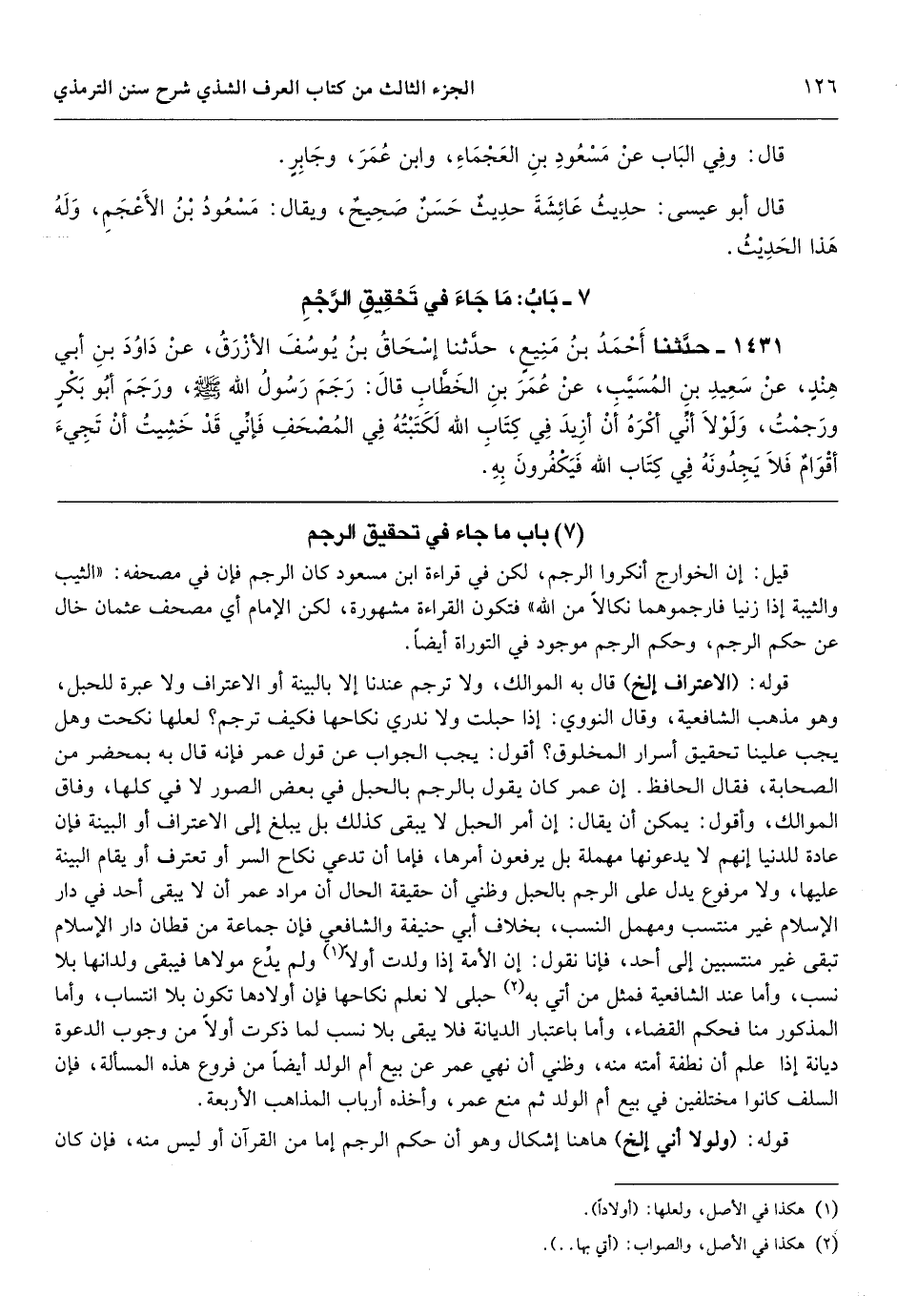 [1431] قيل: إن الخوارج أنكروا الرجم، لكن في قراءة ابن مسعود كان الرجم فإن في مصحفه: «الثيب والثيبة إذا زنيا فارجموهما نكالاً من الله» فتكون القراءة مشهورة، لكن الإمام أي مصحف عثمان خال عن حكم الرجم، وحكم الرجم موجود في التوراة أيضاً.