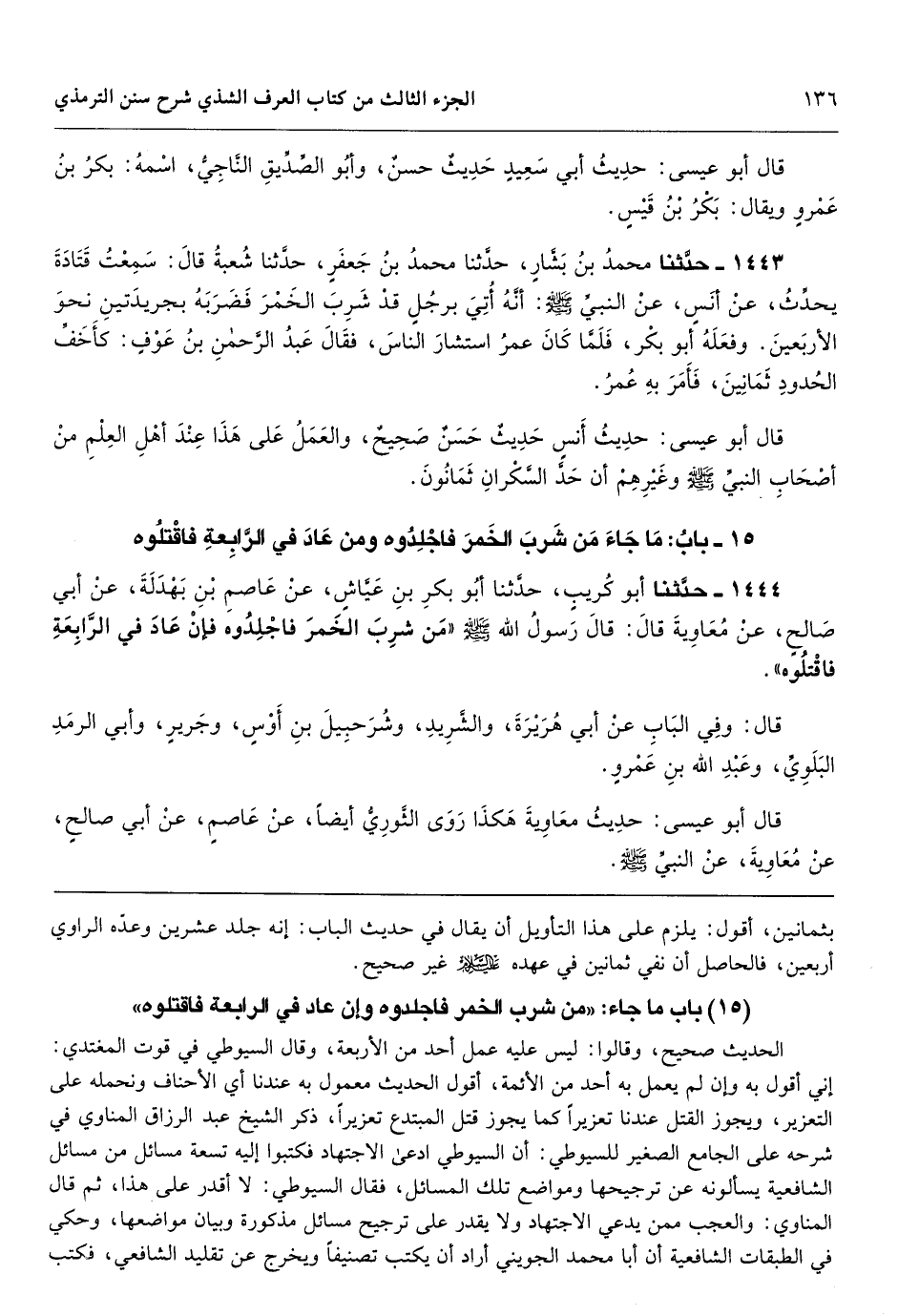[1444] الحديث صحيح، وقالوا: ليس عليه عمل أحد من الأربعة، وقال السيوطي في قوت المغتدي: إني أقول به وإن لم يعمل به أحد من الأئمة، أقول الحديث معمول به عندنا أي الأحناف ونحمله على التعزير، ويجوز القتل عندنا تعزيراً كما يجوز قتل المبتدع تعزيراً، ذكر الشيخ عبد الرزاق المناوي في شرحه على الجامع الصغير للسيوطي: أن السيوطي ادعى الاجتهاد فكتبوا إليه تسعة مسائل من مسائل الشافعية يسألونه عن ترجيحها ومواضع تلك المسائل، فقال السيوطي: لا أقدر على هذا، ثم قال المناوي: والعجب ممن يدعي الاجتهاد ولا يقدر على ترجيح مسائل مذكورة وبيان مواضعها، وحكي في الطبقات الشافعية أن أبا محمد الجويني أراد أن يكتب تصنيفاً ويخرج عن تقليد الشافعي، فكتب