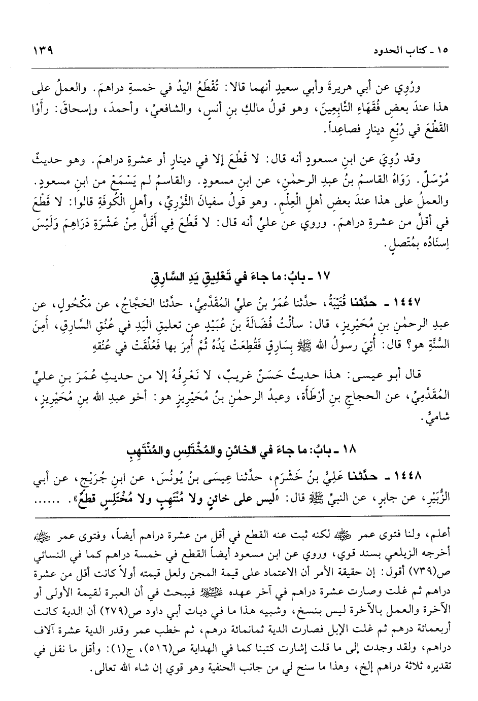 أعلم، ولنا فتوى عمر لكنه ثبت عنه القطع في أقل من عشرة دراهم أيضاً، وفتوى عمر أخرجه الزيلعي بسند قوي، وروي عن ابن مسعود أيضاً القطع في خمسة دراهم كما في النسائي ص (739) أقول: إن حقيقة الأمر أن الاعتماد على قيمة المجن ولعل قيمته أولاً كانت أقل من عشرة دراهم ثم غلت وصارت عشرة دراهم في آخر عهده فيبحث في أن العبرة لقيمة الأولى أو الآخرة والعمل بالآخرة ليس بنسخ، وشبيه هذا ما في ديات أبي داود ص (279) أن الدية كانت أربعمائة درهم ثم غلت الإبل فصارت الدية ثمانمائة درهم، ثم خطب عمر وقدر الدية عشرة آلاف دراهم، ولقد وجدت إلى ما قلت إشارت كتبنا كما في الهداية ص (516) ، ج (1) : وأقل ما نقل في تقديره ثلاثة دراهم إلخ، وهذا ما سنح لي من جانب الحنفية وهو قوي إن شاء الله تعالى.