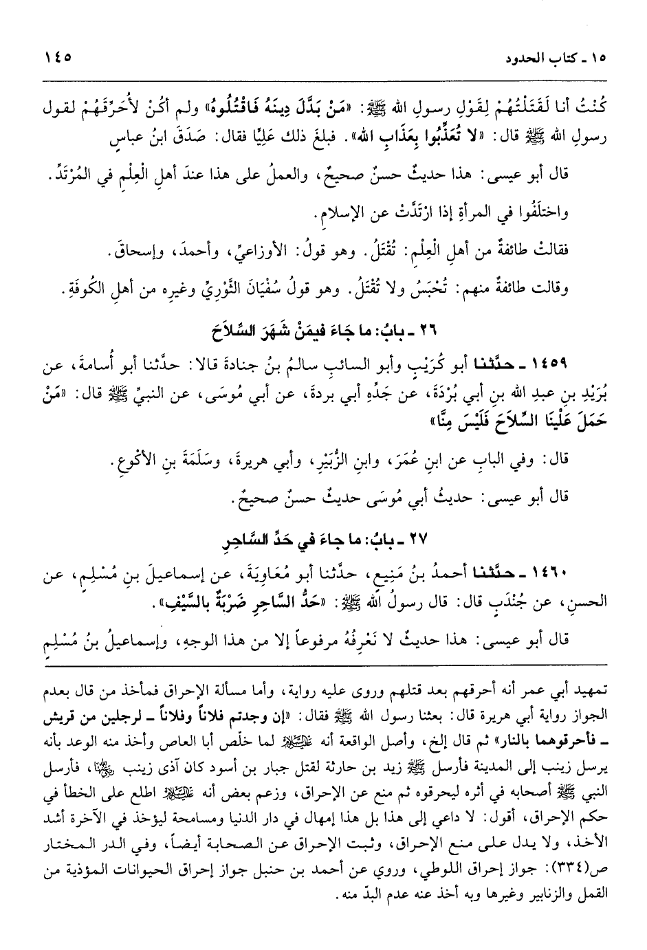 أبي عمر أنه أحرقهم بعد قتلهم وروى عليه رواية، وأما مسألة الإحراق فمأخذ من قال بعدم الجواز رواية أبي هريرة قال: بعثنا رسول الله - صَلَّى اللهُ عَلَيْهِ وَسَلَّمَ - فقال: «إن وجدتم فلاناً وفلاناً ـ لرجلين من قريش ـ فأحرقوهما بالنار» ثم قال إلخ، وأصل الواقعة أنه لما خلّص أبا العاص وأخذ منه الوعد بأنه يرسل زينب إلى المدينة فأرسل - صَلَّى اللهُ عَلَيْهِ وَسَلَّمَ - زيد بن حارثة لقتل جبار بن أسود كان آذى زينب، فأرسل النبي - صَلَّى اللهُ عَلَيْهِ وَسَلَّمَ - أصحابه في أثره ليحرقوه ثم منع عن الإحراق، وزعم بعض أنه اطلع على الخطأ في حكم الإحراق، أقول: لا داعي إلى هذا بل هذا إمهال في دار الدنيا ومسامحة ليؤخذ في الآخرة أشد الأخذ، ولا يدل على منع الإحراق، وثبت الإحراق عن الصحابة أيضاً، وفي الدر المختار ص (334) : جواز إحراق اللوطي، وروي عن أحمد بن حنبل جواز إحراق الحيوانات المؤذية من القمل والزنابير وغيرها وبه أخذ عنه عدم البدّ منه.