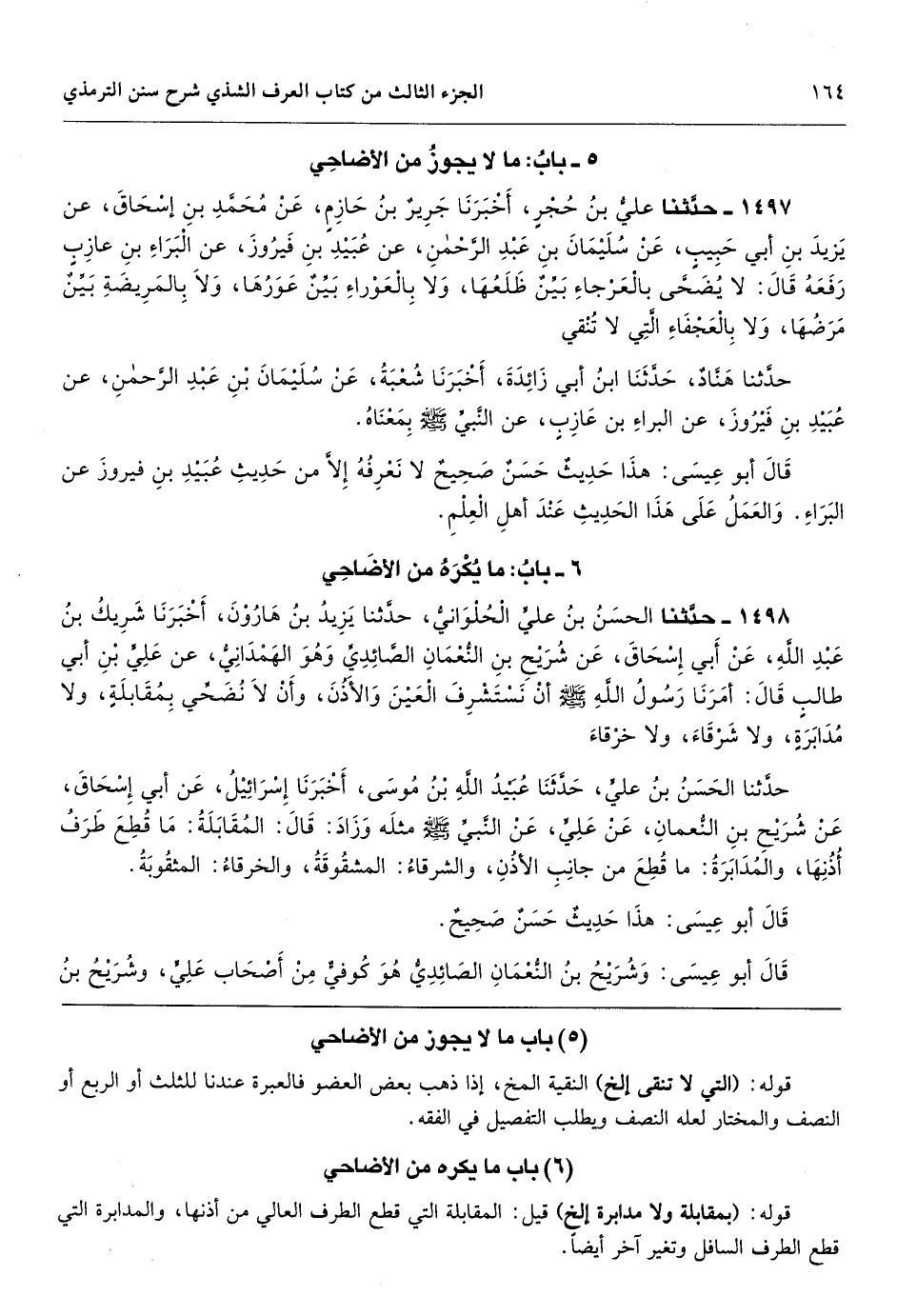[1498] قوله: (بمقابلة ولا مدابرة إلخ) قيل: المقابلة التي قطع الطرف العالي من أذنها، والمدابرة التي قطع الطرف السافل وتغير آخر أيضاً.