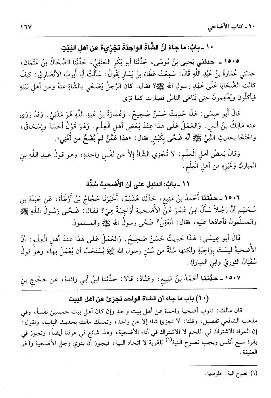 [1505] قال مالك: تنوب أضحية واحدة عن أهل بيت واحد وإن كان أهل بيت خمسين نفساً، وفي مذهب الشافعي تفصيل، وقلنا: لا تجزئ شاة إلا عن واحد، وتمسك مالك بحديث الباب، ونقول: إن المراد الاشتراك في اللحم لا الاشتراك في أداء الأضحية، وهذا شائع في عرفنا أيضاً، وتجوز في بقرة سبع أنفس ويجب نصوح النية للقربة لا اتحاد النية، فيجوز أن ينوي رجل الأضحية وآخر العقيقة.